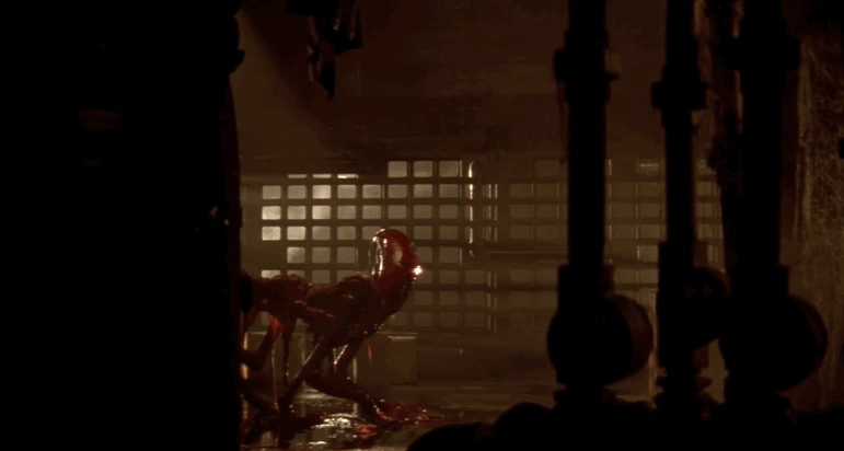 一名清洁工在清理通风管道的墙壁,他发现了地上异形蜕变留下的皮,下水口的铁网也被腐蚀出一个洞,就在他想要看清洞底是什么东西时,被异形狗撞破脑袋,然后被排风扇搅成了渣渣