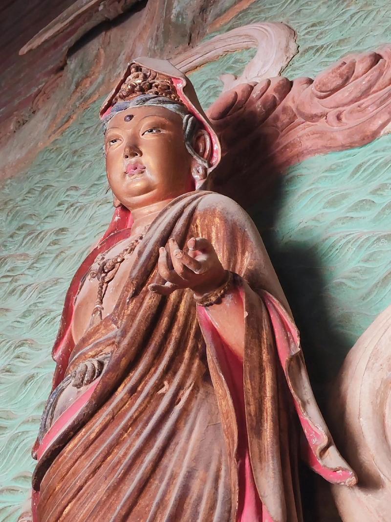 必玩3个“有灵魂的点”,拒绝走马观花弥陀殿“渡海观音悬塑实测”:"当‘一日’‘元代匠人’"用“卷尺”量悬塑高度(2.8米)、鳌头尺寸(长1.2米),听彩塑专家讲“沥粉贴金”技法(“用桐油调石膏粉堆出衣纹凸起,再贴金箔,历经700年不脱落,比敦煌壁画更立体”)。运城彩塑爱好者王先生说:“站在殿内仰头看,观音衣袂仿佛真的在‘飘’,古人‘以假乱真’的功力太绝了!”