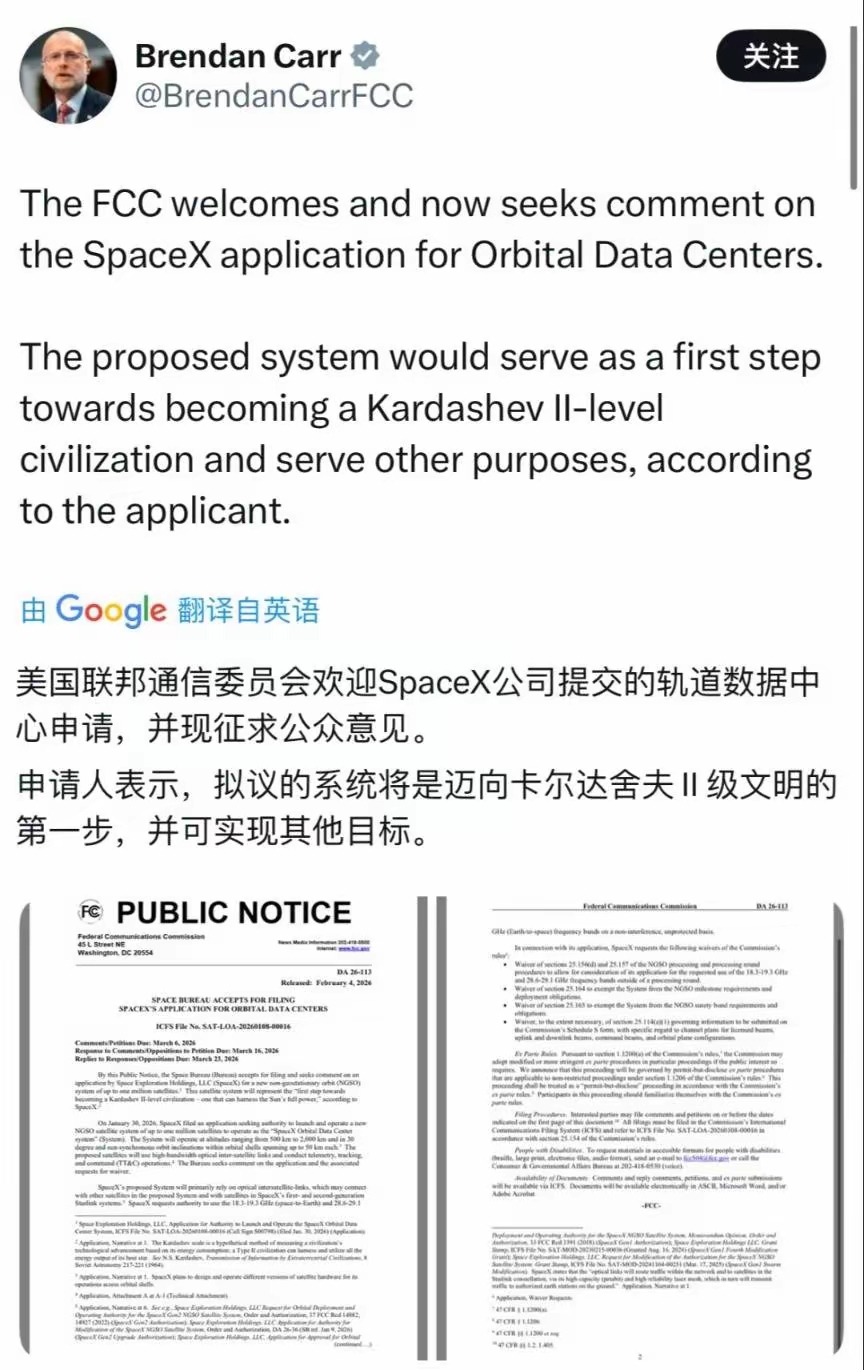 FCC主席布伦丹·卡尔也在社交媒体发文表态,对SpaceX的轨道数据中心申请表示欢迎,同时附上受理及征求意见的相关公告,进一步明确了该申请的推进节奏,暂无明显审批阻碍。