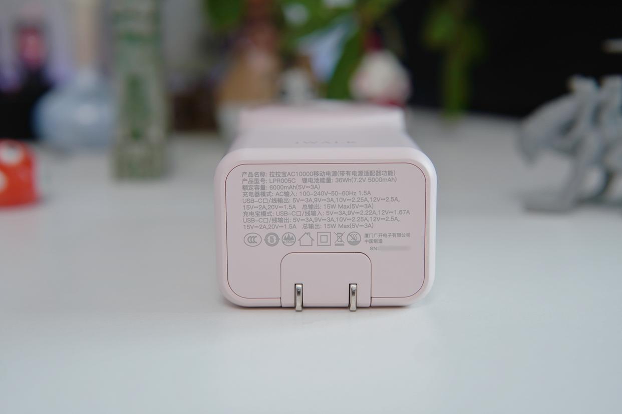 ▲充电宝底部罗列了详细的各接口输入、输出电压/电流,值得注意的是,iWALK三合一能量兔既可以作为充电宝使用,也可以通过AC插头作为充电器为外部设备供电。AC插头在非使用状态下时,可以完美隐藏在iWALK三合一能量兔的底部。