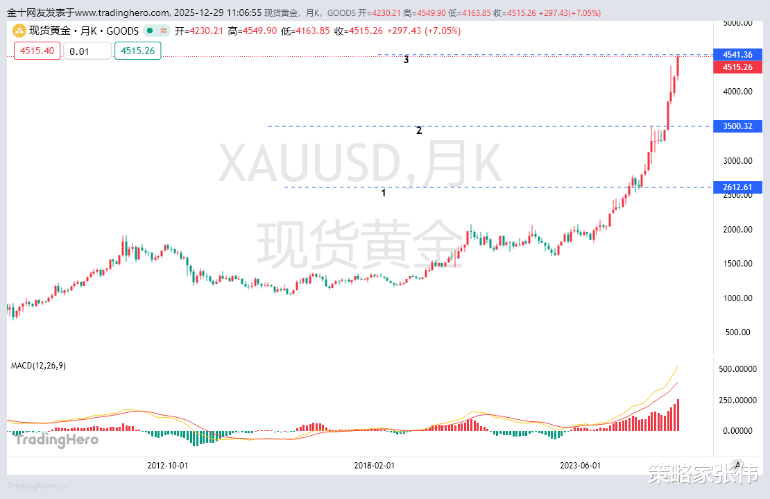 如果你打开黄金月线图仔细观察,你会发现黄金从2025年的12月份形成上涨之后,黄金已经涨了整整一年的时间了。