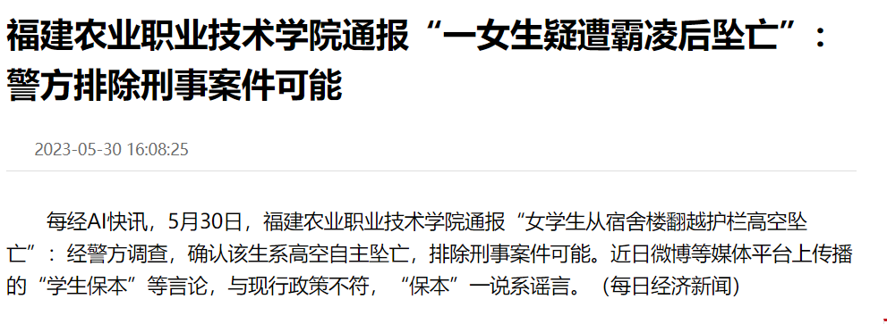 2023年5月30日,福建农业职业技术学院通报称,该学院一名女生于5月26日20时许,从学生宿舍翻越护栏高空坠亡。