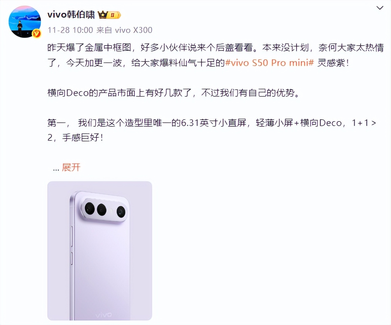 此次影像方向上,该系列新机希望提供极致的旗舰体验,配合OriginOS 6操作系统带来的全新「Live路人消除」,可以让每一张Live照片中的你都是主角。小屏党的惊喜更多,这次的vivo S50 Pro mini将要实现性能与续航的 “超强组合拳”:一者是高通骁龙8gen5+LPDDR5X Ultra+ UFS4.1,一者是6500mAh蓝海电池+90W远航闪充+40W无线闪充,这些全都会用到这款6.31英寸小直屏上,再加上指纹解锁、防尘防水等方面的升级优化,卓越实力看得见。