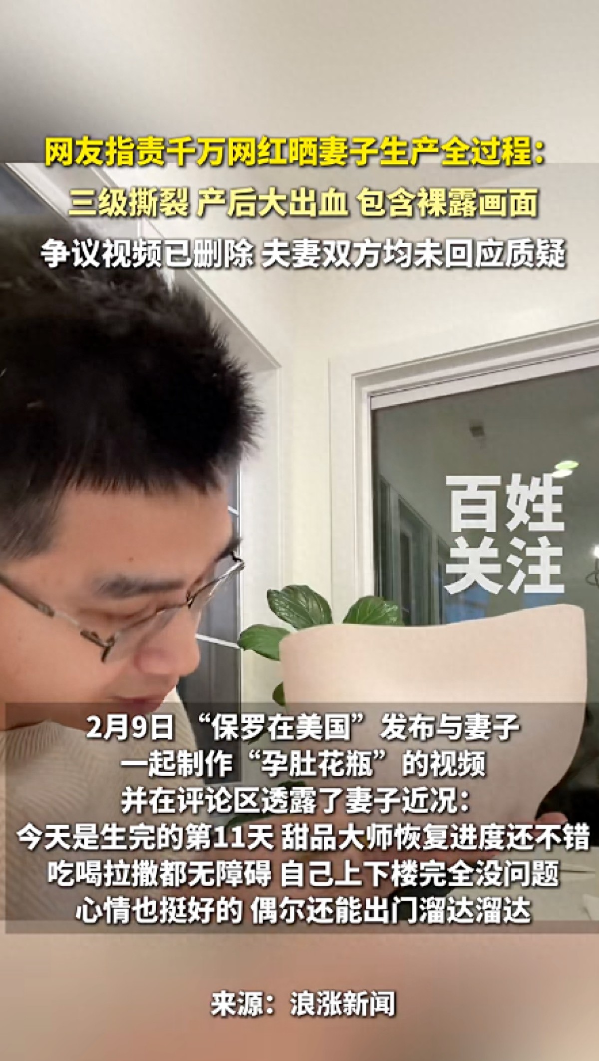 2月10日,博主“保罗在美国”发布的妻子“保罗的甜品大师”在美国分娩的全过程视频引发舆论争议,视频公开裸露画面及抢救细节,视频中还植入了尿不湿广告,被批评“为了流量过度消费伴侣隐私”。但也有网友对该视频表示了支持,认为这个是真实展现了女性生产的不易。