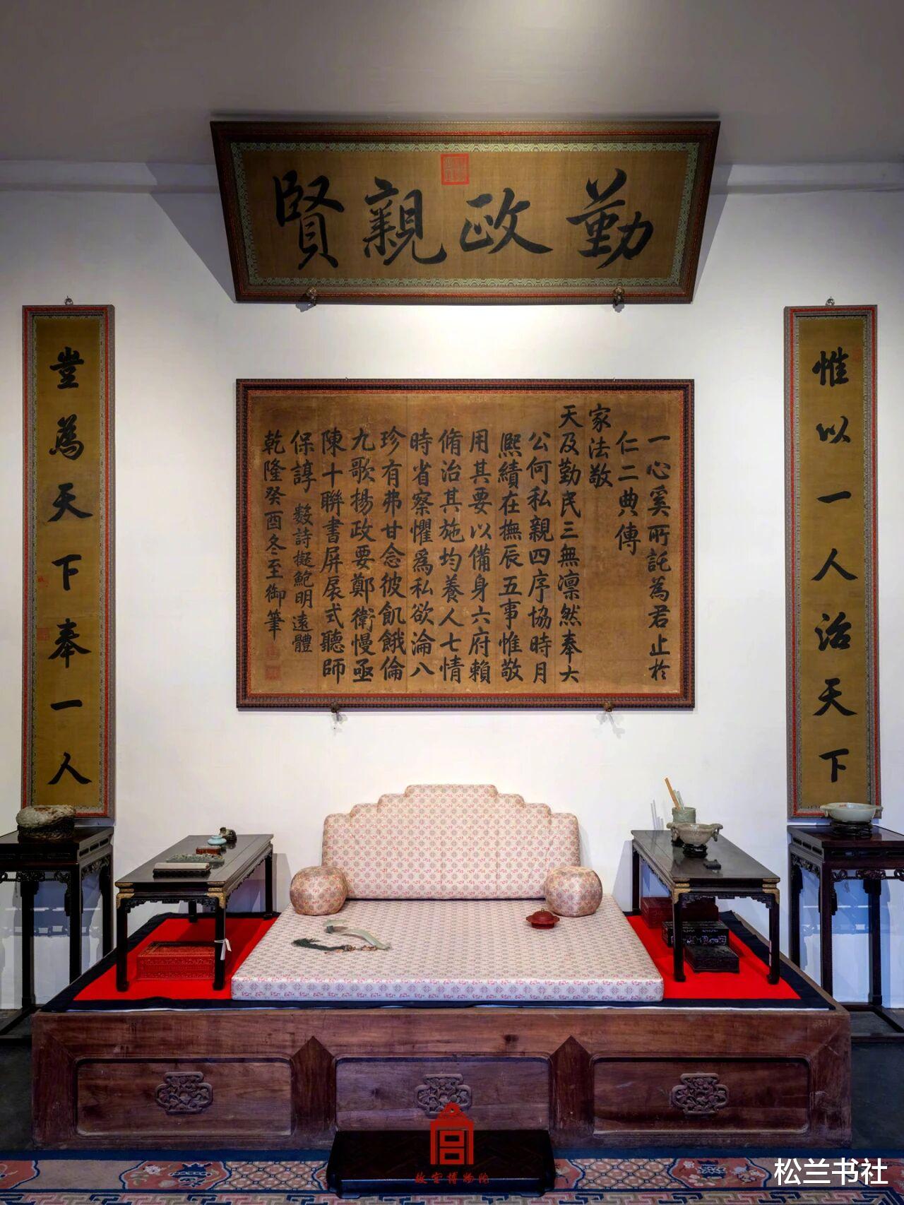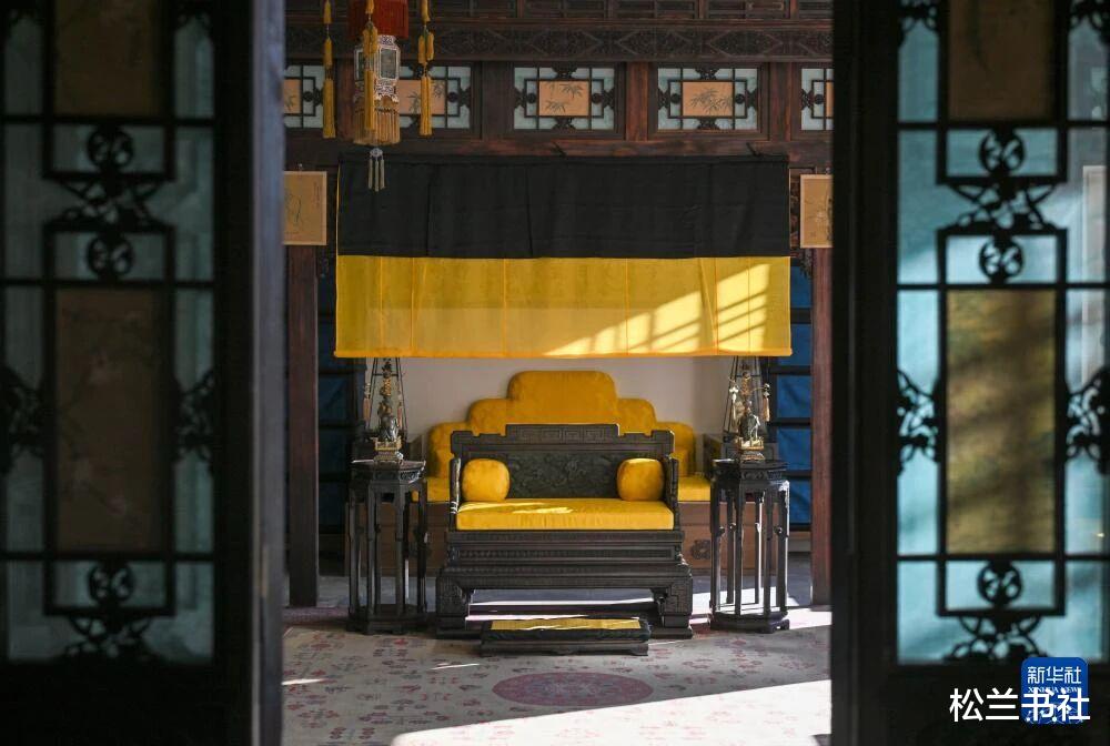 在匾额下方,一一归位了紫檀木宝座、青铜香几、朱红宫扇等陈设,复刻了当年的议事场景,再现古时君臣议事时的肃穆氛围