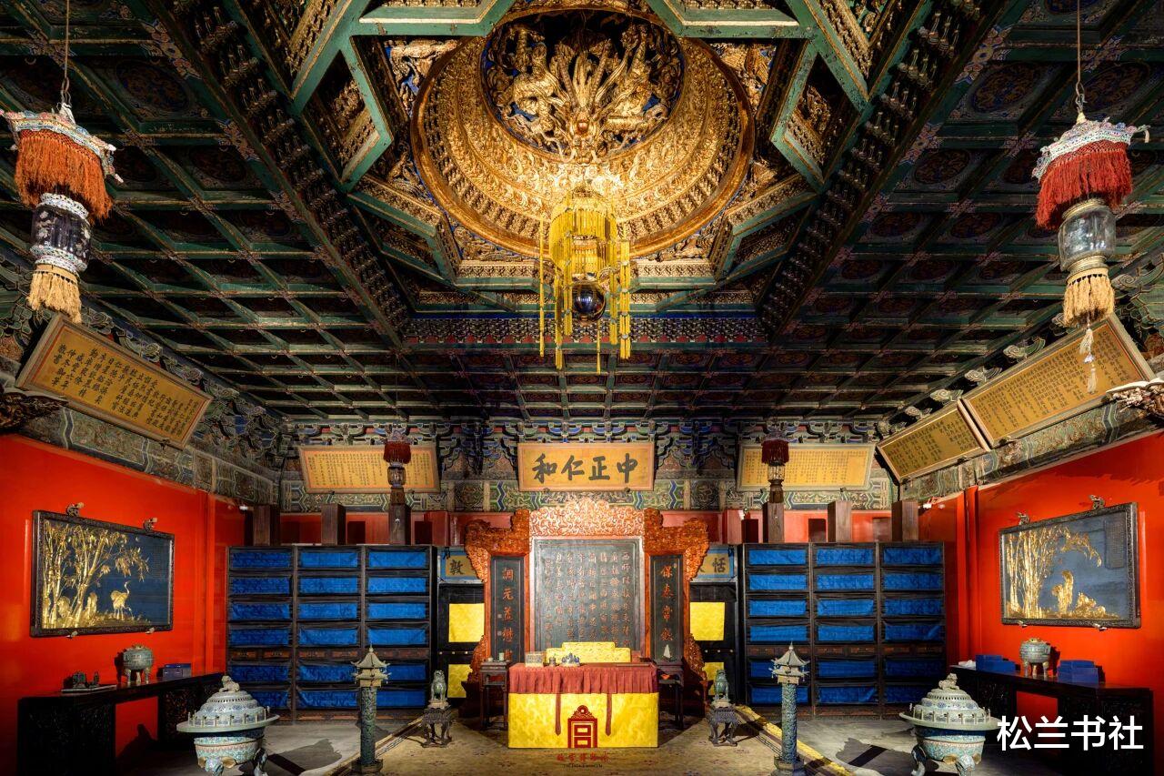 整个空间的关注点,是宝座上方高悬的“中正仁和”匾额,由雍正皇帝亲笔御书,其中的“中正”引自《周易·履卦》“刚中正,履帝位而不疚,光明也”,寓意帝王应秉持公正无私的执政原则和不偏不倚的为人处事中庸之道,“仁和”则寓意仁爱、和谐。