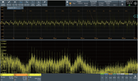 在电源设计中,例如用于有刷直流电机的电机驱动器,模拟和数字电路共存于同一印刷电路板上。设计者必须考虑这种复杂性,特别是在电源线上存在的传导发射方面。如果印刷电路板设计不当,微控制器或SPI等总线通信的时钟可能会导致发射。有时总线活动并非连续发生;它们通常由其他外部系统控制器触发。在测量电源线上的传导发射时,这些总线活动通常会在频谱中引起偶发事件。示波器是开发过程中调试传导发射的标准仪器。然而,对于检测频谱中非常短暂和偶发的事件,具有标准FFT实现的示波器存在局限性。这主要是由于在显示FFT频谱之前需要耗费大量时间的计算过程。在计算FFT频谱时,可能会遗漏异常、短暂、偶发的事件。更快的FFT性能对于定位和隔离根本原因至关重要。