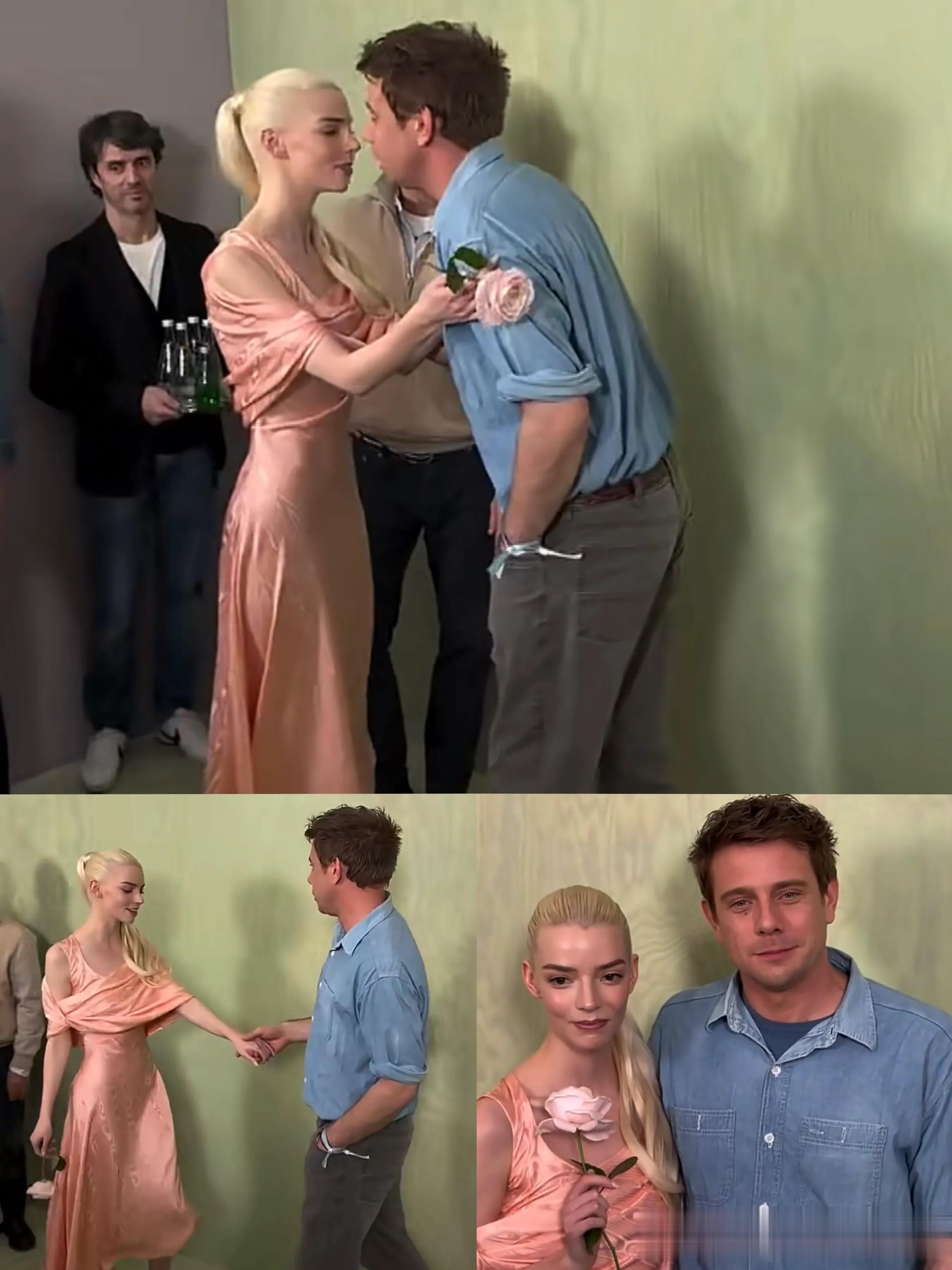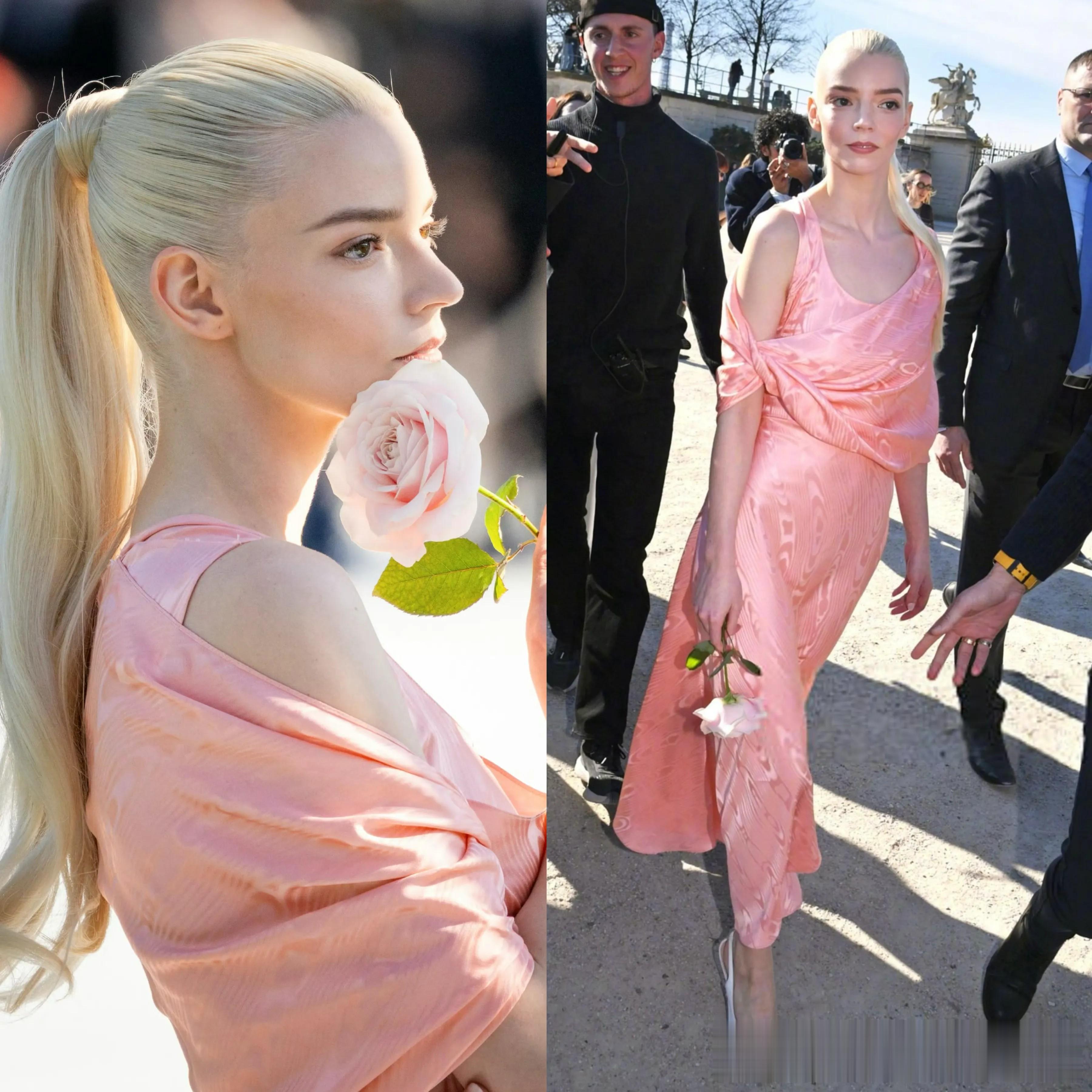一身粉裙,拿着粉色玫瑰的她,一亮相就如女神降临,一头金发外阳光下自带光芒。