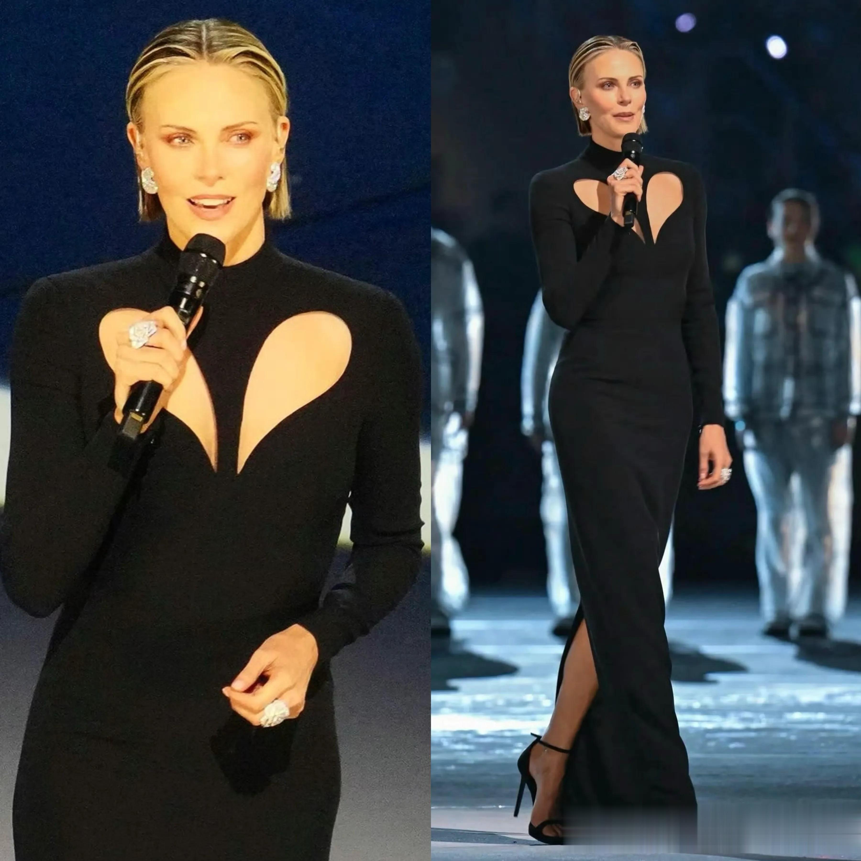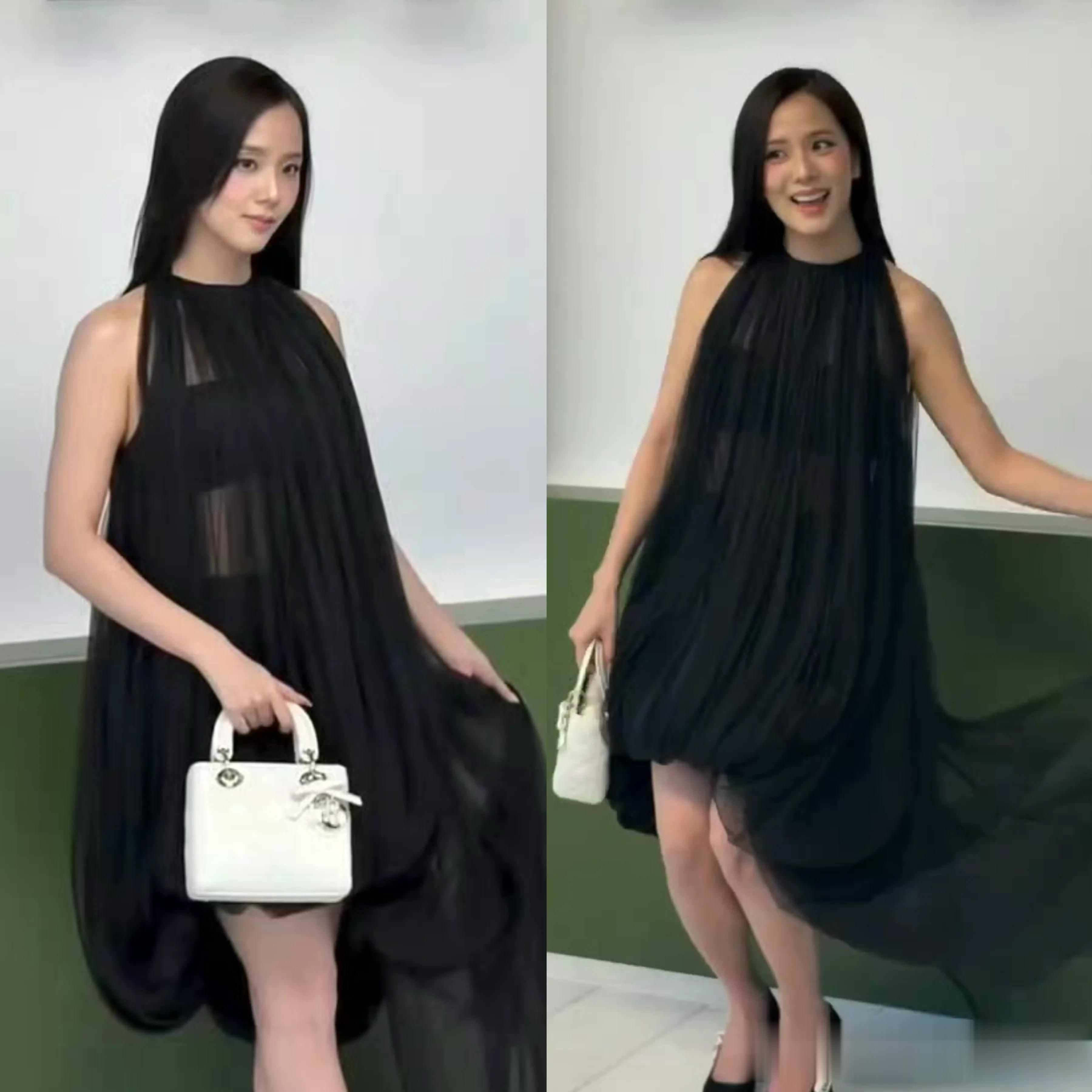 王楚然的这条黑色裙子其实很难驾驭,远看就在一块布。