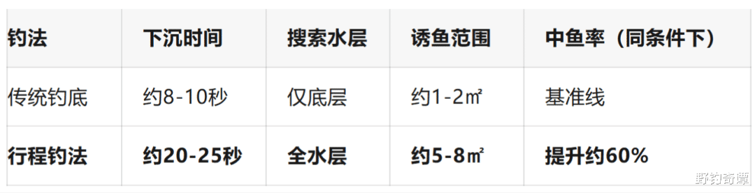错!钓浮是固定在一个水层守株待兔,钓行程是每个水层都“打个招呼”。打个比方:钓浮就像你在二楼等朋友,钓行程是你从一楼走到五楼,每层都跟美女搭讪——机会能一样吗?
