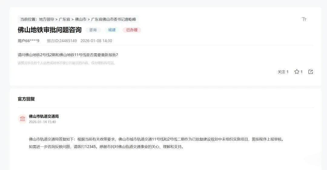 日前,有人在网上询问,佛山地铁2号线2期和11号线,是否需要重新报批。佛山有关部门针对该问题进行了公开答复,大致意思是说,佛山市城市轨道交通11号线和2号线二期,作为已批复建设规划中未组织实施项目,需按程序上报审核。