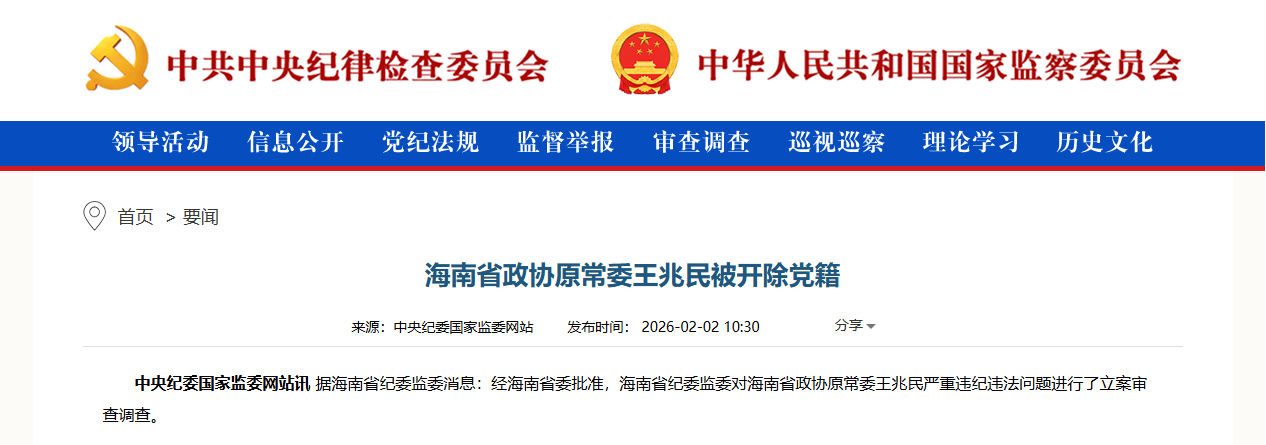 中央纪委国家监委网站讯据海南省纪委监委消息:经海南省委批准,海南省纪委监委对海南省政协原常委王兆民严重违纪违法问题进行了立案审查调查。
