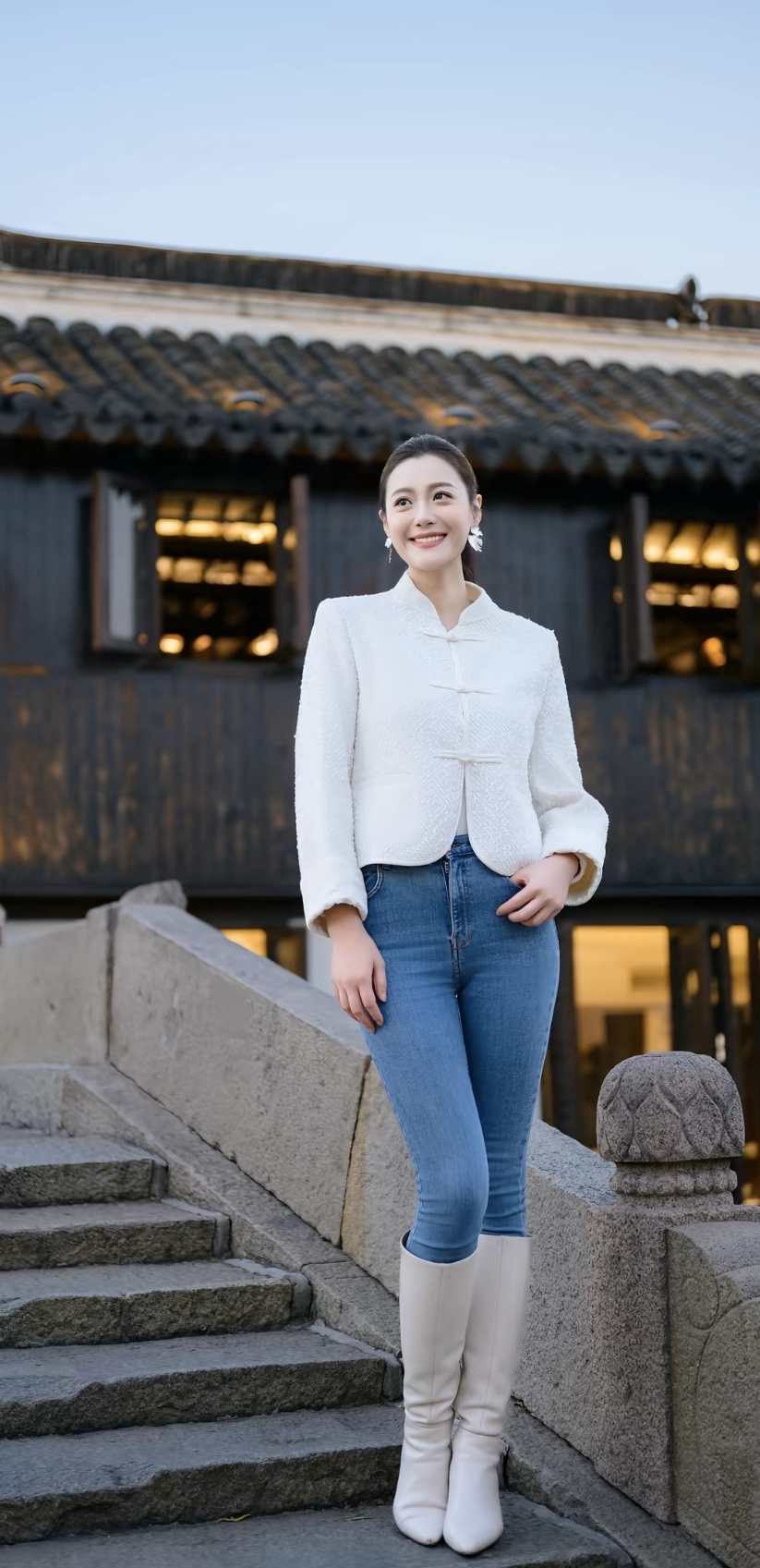 白色中式盘扣短外套搭配蓝色紧身牛仔裤与白色高筒靴,将古典韵味与现代休闲感巧妙融合。纸伞灯笼映衬下,诠释出温婉灵动的新中式