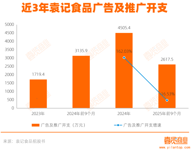 食安事件发生同期,袁记食品也正式出海,2024年12月海外首店在新加坡开业。袁记食品既要平息大陆地区的舆论,又要在海外造势,双重叠加下,当年的广告及推广开支上升至4505.4万元,同比增长超162.03%,这笔支出占销售及营销开支的比例也从2023年的22.34%上升至35.79%。