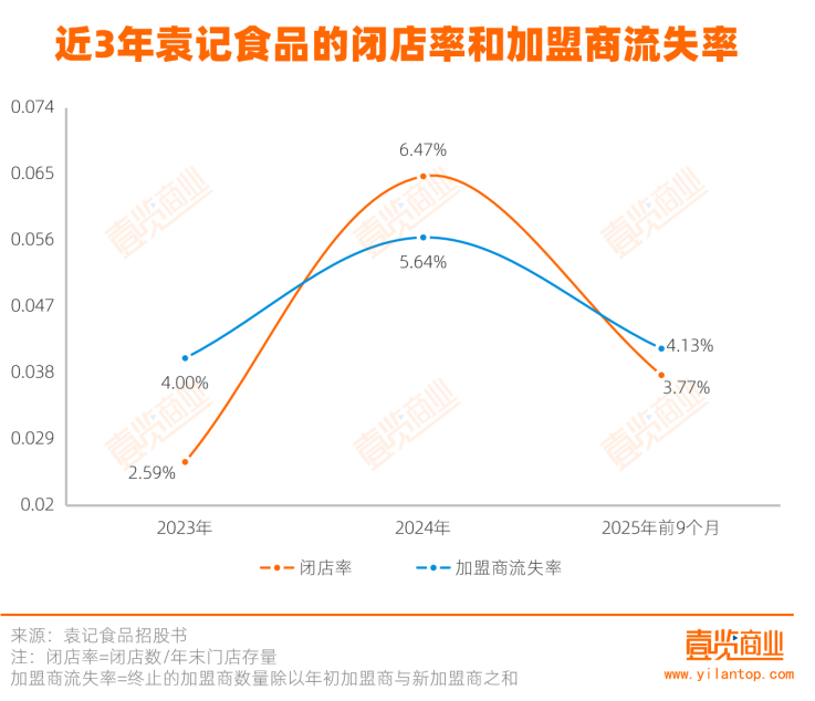 其联合创始人田伟曾公开表示,2024年冬至后,部分门店的营收在短时间内暴跌30%。招股书数据也有所体现:2023年闭店率为2.59%,加盟商流失率为4%;2024年,闭店率飙升至6.47%,加盟商流失率达5.64%。