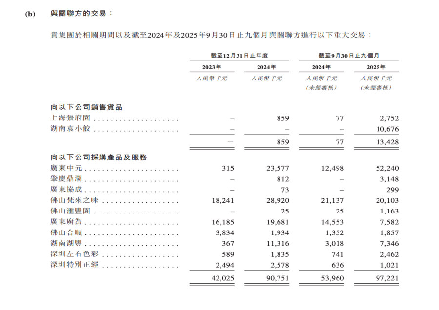 这些关联企业覆盖了从原料、设备、包装、调味品到门店装修、广告营销的几乎所有经营环节,且关联采购金额持续增长,根据招股书披露,2023年,袁记食品在这些公司累计采购额达4134.3万元,2024年上升至5497.3万元,2025年前9个月达3418.8万元。
