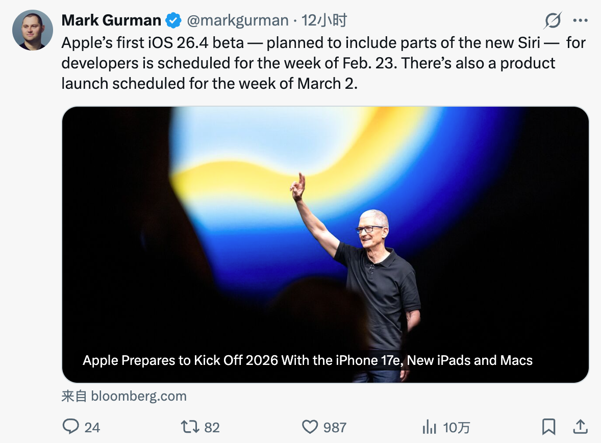 软件方面,苹果计划在2月23日当周,向开发者推送iOS 26.4首个测试版,系统将搭载新版Siri部分功能,为用户带来更智能的交互体验,这也是苹果持续优化语音助手的重要动作。