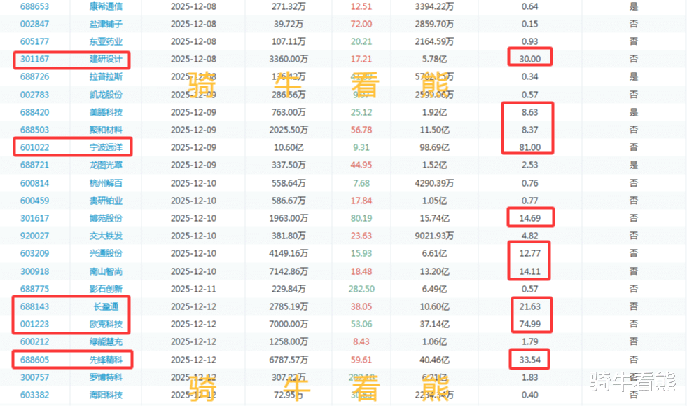12月12日(周五)长盈通解禁比例达到21.63%;欧克科技解禁比例达到74.99%;先锋精科解禁比例达到33.54%。