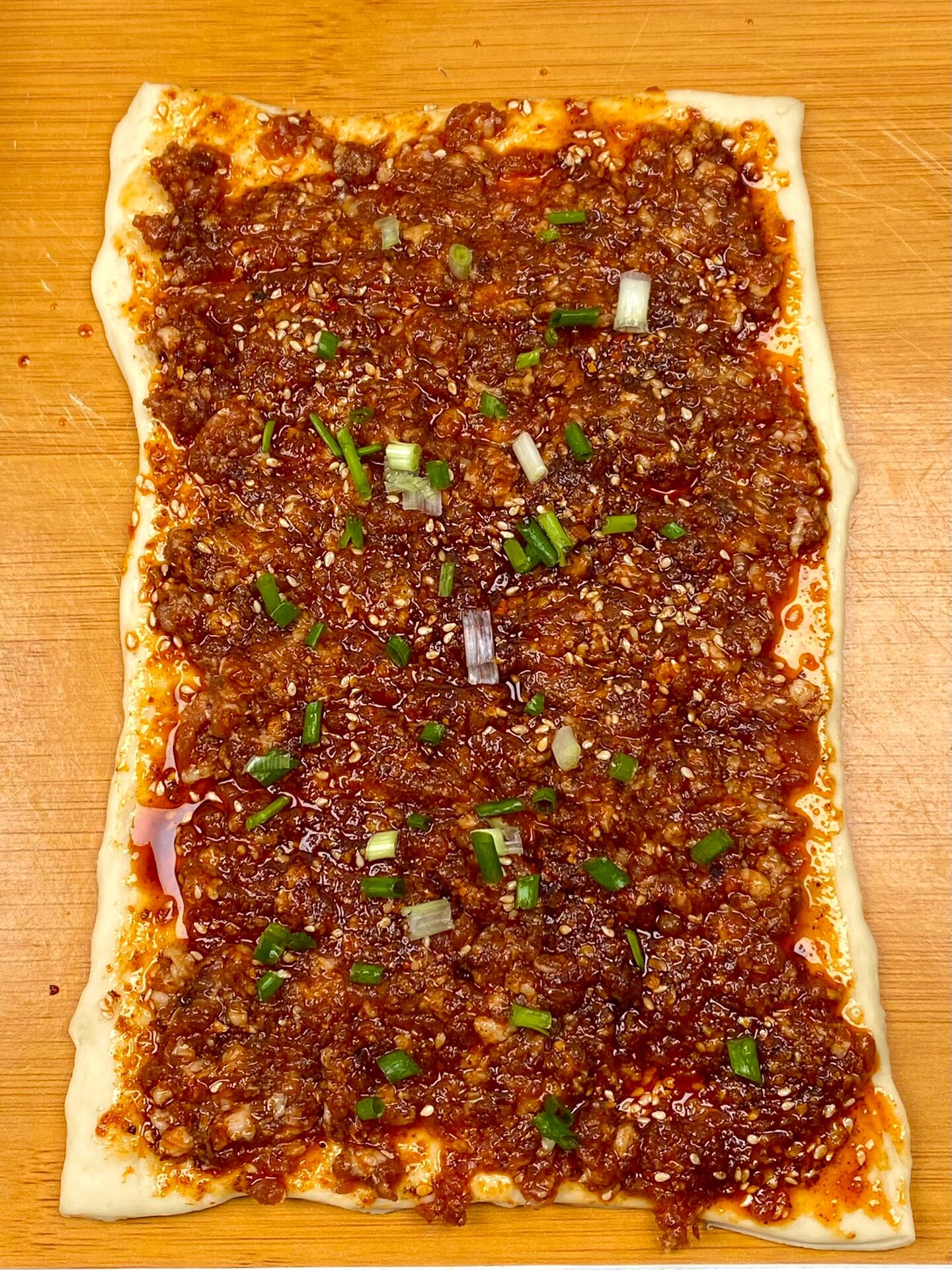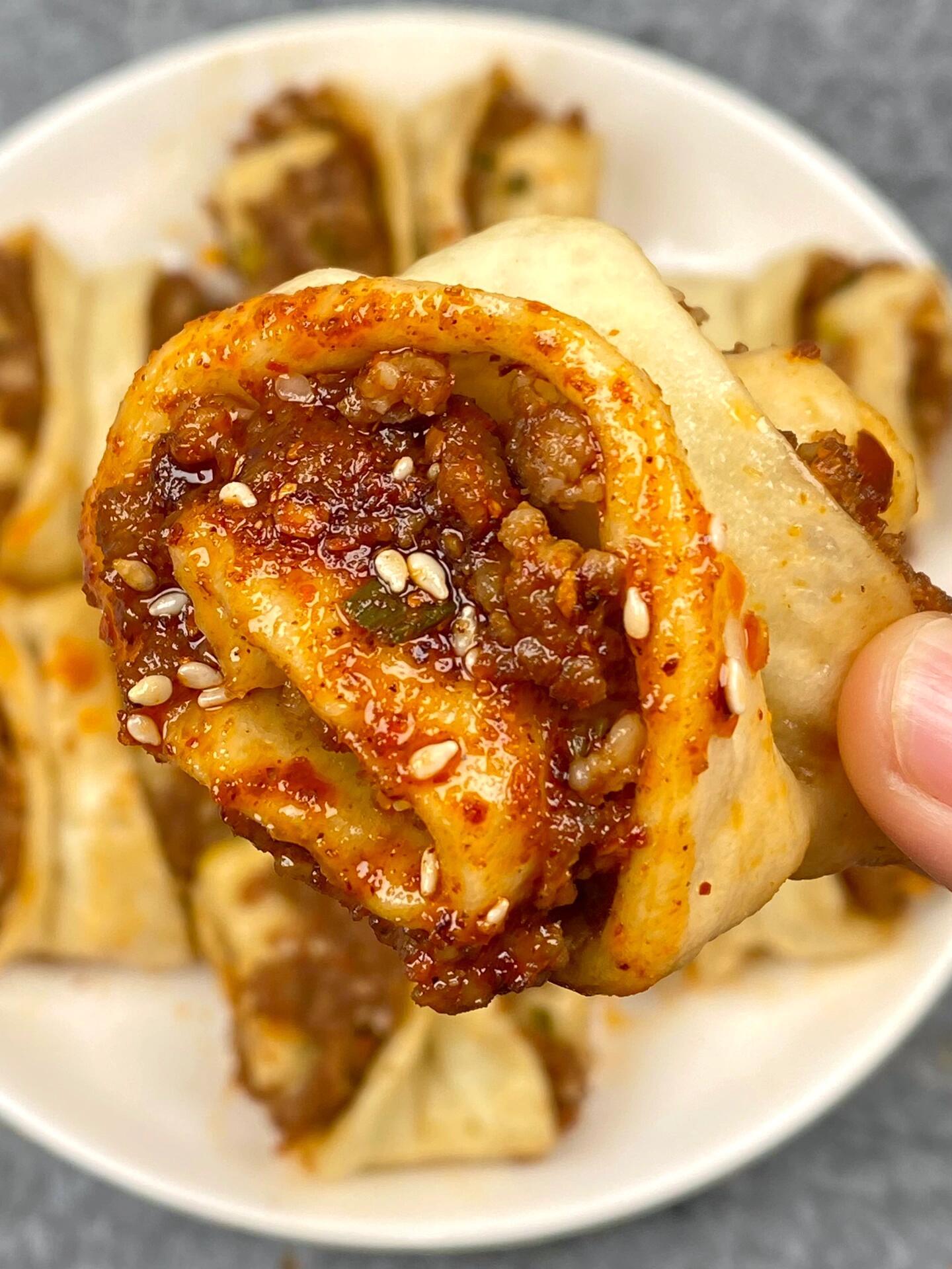 咬一口,面皮蓬松暄软,带着酱汁的香辣味,肉沫鲜嫩多汁,十三香的复合香味在嘴里散开,辣椒的辣恰到好处,不呛不燥。最妙的是那一层层的结构,每一口都有面有肉,越嚼越香,根本停不下来。那种满足感,比外面买的花卷强太多了——毕竟自己做的,肉舍得放,料舍得加。