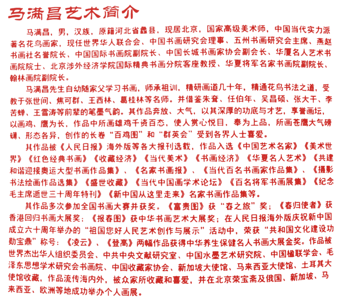 马满昌笔下的鸡、鹤、马、鹰,皆非单纯描摹,而是笔墨与心性的共生。他以笔为媒,融传统与当代审美,作品兼具物象之美与精神之深。其作品被海内外机构藏家珍视,多地举办个展,既彰显个人修为,更为当代花鸟走兽画传承发展,提供了厚重范本。