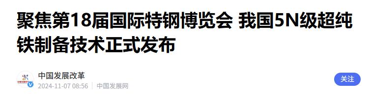 中国发展改革 2024-11-07——聚焦第18届国际特钢博览会 我国5N级超纯铁制备技术正式发布