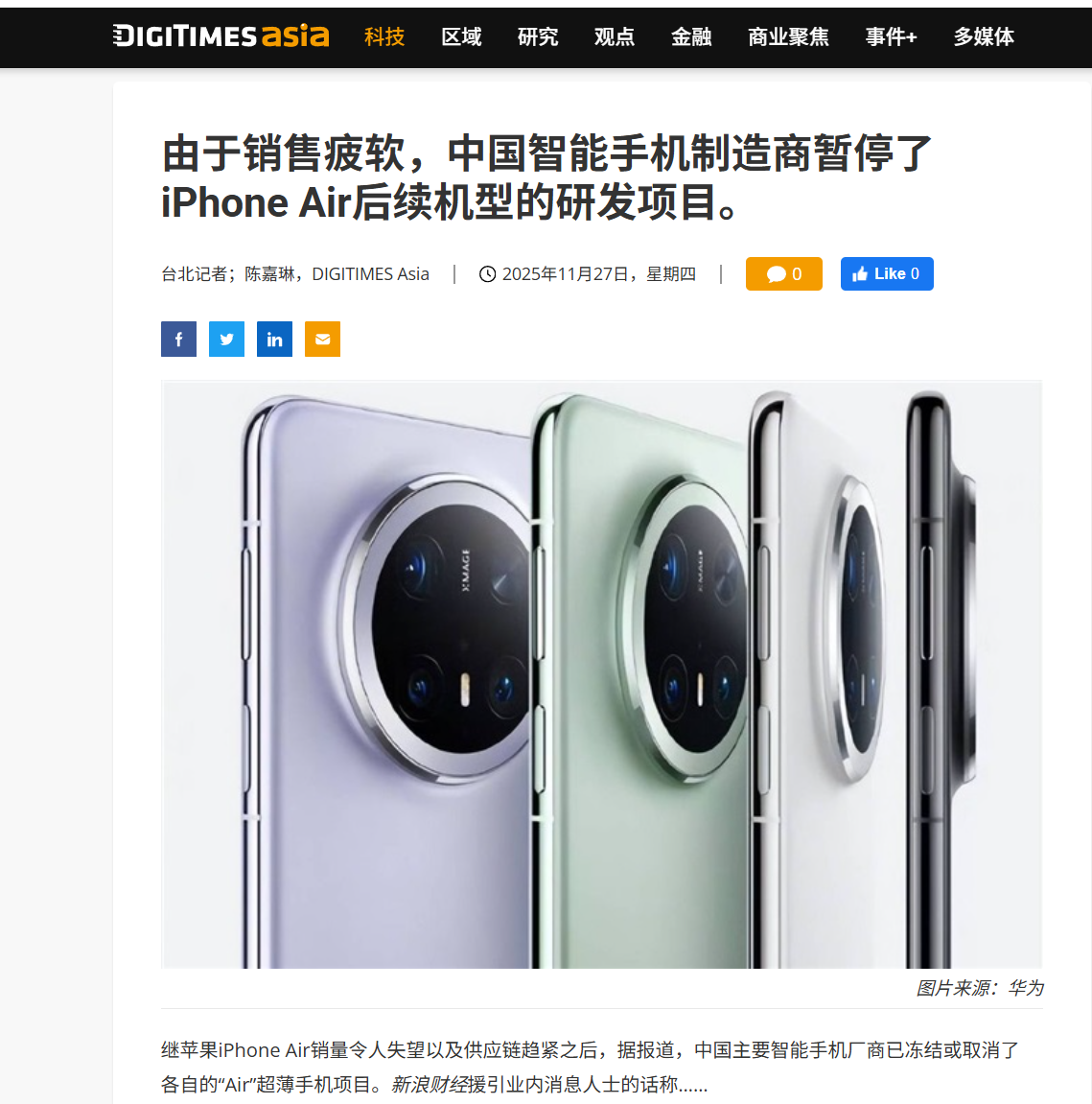 首先是iPhone Air 的失败为 iPhone Fold 投下阴影,上周,对 iPhone Air 来说又是糟糕的一周。这款因“超薄轻便”被寄予厚望的机型,因销量惨淡而彻底失败,据行业消息,包括 Xiaomi、Oppo、Vivo 等厂商已放弃推出类似“超轻薄 iPhone Air”的超薄手机。换句话说,他们似乎都看清了:消费者并不买账。