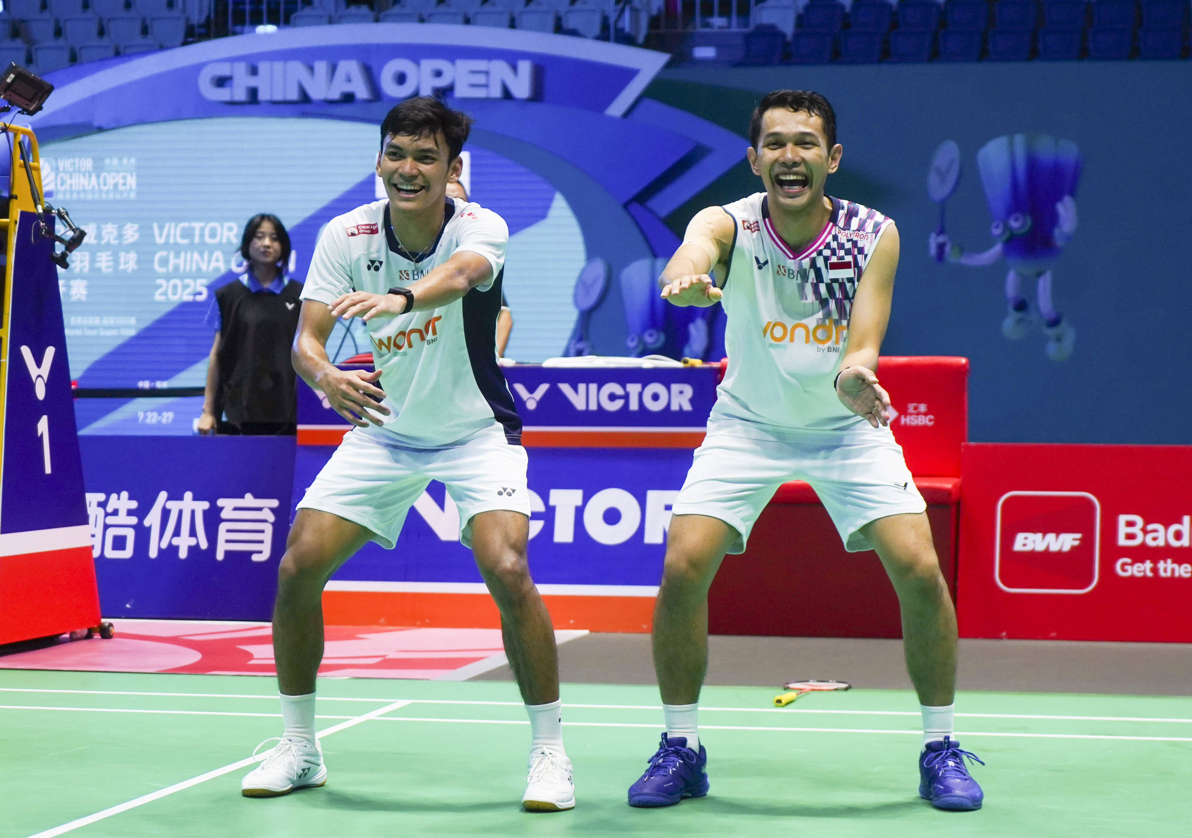 决胜局的较量堪称"生死大战",双方都拿出了看家本领,赛场精彩镜头不断。开局阶段,双方依旧咬得很紧,比分交替上升。当比分来到10平后,因陀罗/华金逐渐找回进攻节奏,他们利用灵活的跑位和默契的配合,多次撕开对手的防线,成功将比分反超。尽管阿尔菲安/菲克里在局末奋力追赶,将比分差距缩小至1分,但因陀罗/华金始终保持着冷静的心态,没有给对手反超的机会。随着华金一记干净利落的后场扣杀落地,比分最终定格为21-18,这对年轻组合成功锁定胜局。
