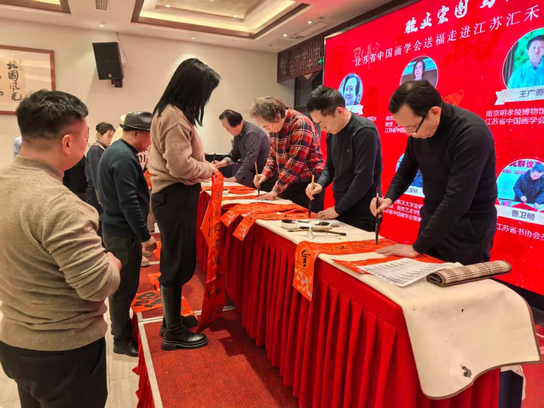 1月17日,马年春节将至,江苏省中国画学会组织文化志愿服务队走进江苏汇禾交通建设工程有限公司,以传统笔墨为企业员工送上新春祝福。学会支部书记张广才、副会长王平、常务理事王广勇,理事李景、刘江峰、杨家林及书法家曹卫明、何国友等一行,用一幅幅饱含深情的福字、春联,让企业文化氛围更添年味儿与人文温度。