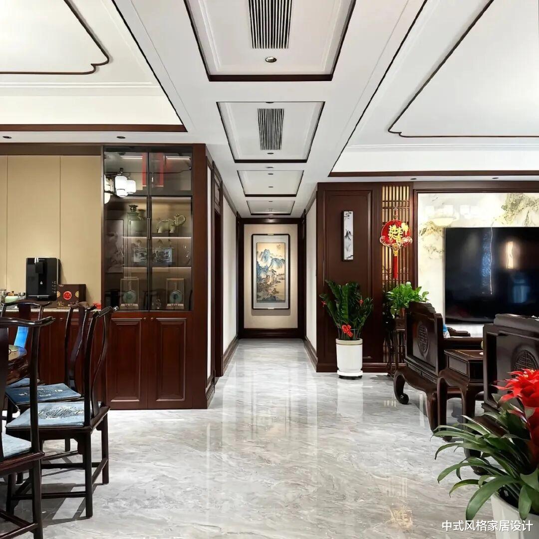 深棕色实木框架搭配白色线条吊顶,墙面以浅色为底,点缀水墨山水挂画与竖幅书法作品。左侧为开放式餐厅,餐边柜内陈列青瓷茶具;右侧是会客区,红木沙发与雕花茶几组合,墙面悬挂红色“福”字挂饰。地面铺设浅灰色大理石地砖,角落绿植与红色花卉增添生机,传统元素与现代设计融合,营造出温润内敛的东方美学氛围。