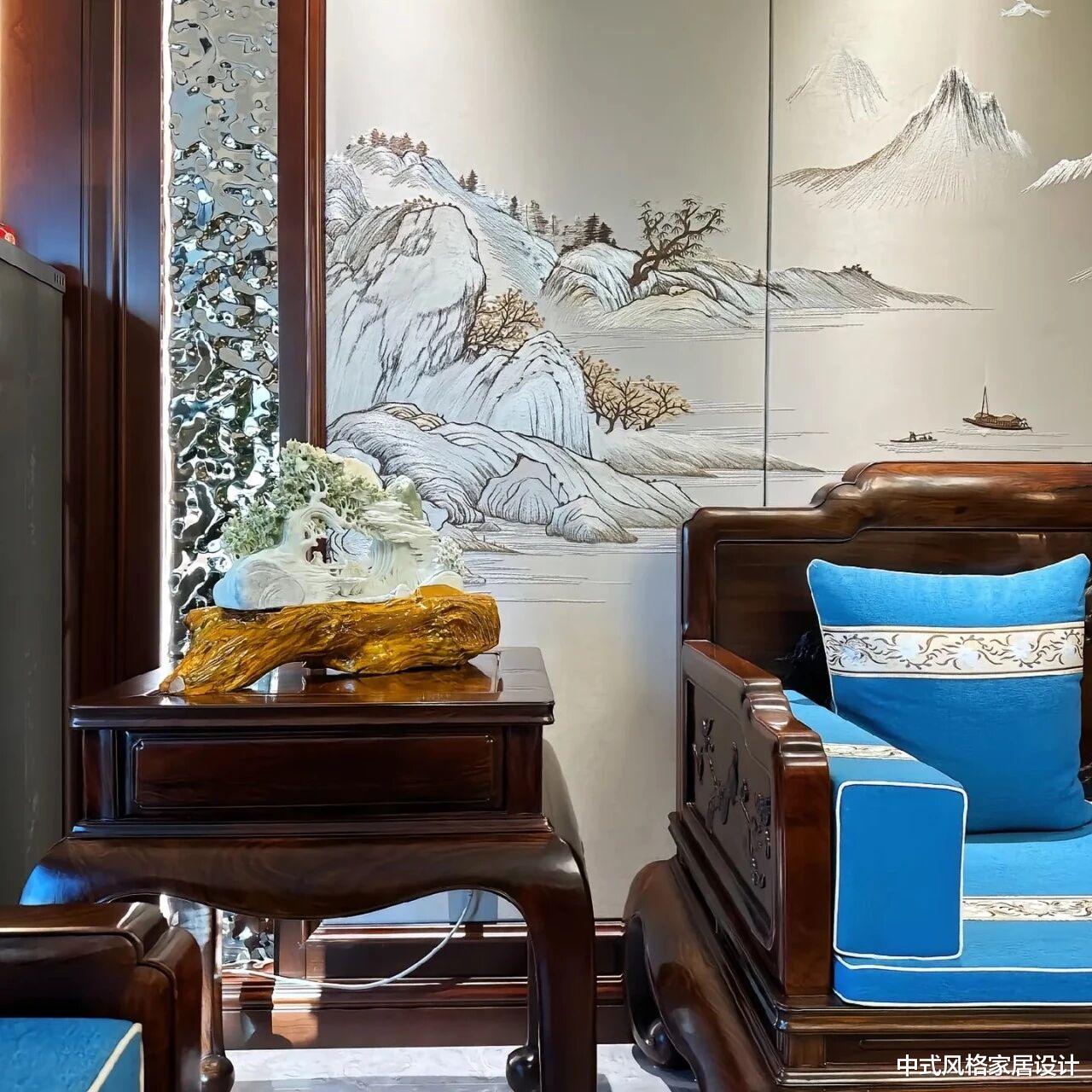 客厅以红木沙发为核心,雕花扶手椅与方正茶几搭配深蓝色靠垫,尽显沉稳雅致。背景墙悬挂水墨山水画,笔触写意间勾勒山峦云雾,与地面大理石纹理相映成趣。顶部多灯头吊灯散发柔和光晕,照亮窗边绿植与案头摆件,整体空间在传统韵味与现代简约中平衡,传递出宁静而富有文化底蕴的居家氛围。
