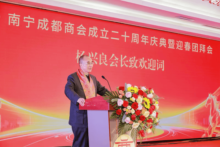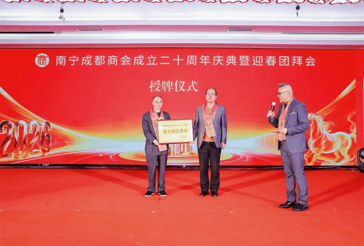 2026年1月16日,广西沃顿国际大酒店国宴厅灯火璀璨、暖意融融,南宁成都商会成立二十周年庆典暨2026年迎春团拜活动在此隆重举行。来自川桂两地政企界代表、商会会员及社会各界嘉宾共400余人齐聚一堂,共忆二十载砥砺征程,共话川桂合作新篇,共贺新春佳节。活动全程贯穿“团结、感恩、创新、奋进”的主旋律,尤其对商会杨兴良会长深耕公益、心系教育的爱心善举进行了重点彰显。