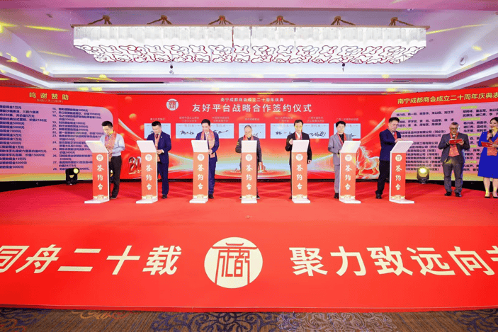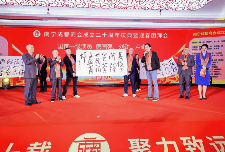在战略合作签约仪式上,南宁成都商会分别与中国商协会协同创新平台、四川大学校友会广西分会、越南中国企业商会川渝企业分会、广西东盟商贸企业发展促进会、重庆商界集团、广西川渝籍商会联盟等7家单位签订合作协议,标志着商会在资源整合、跨界合作方面迈出坚实步伐。国家一级演员唐国强、刘劲、卢奇亲临现场,赠送书法作品并献上精彩表演,为活动增添了浓厚的文化氛围,也表达了对商会二十华诞的美好祝愿。