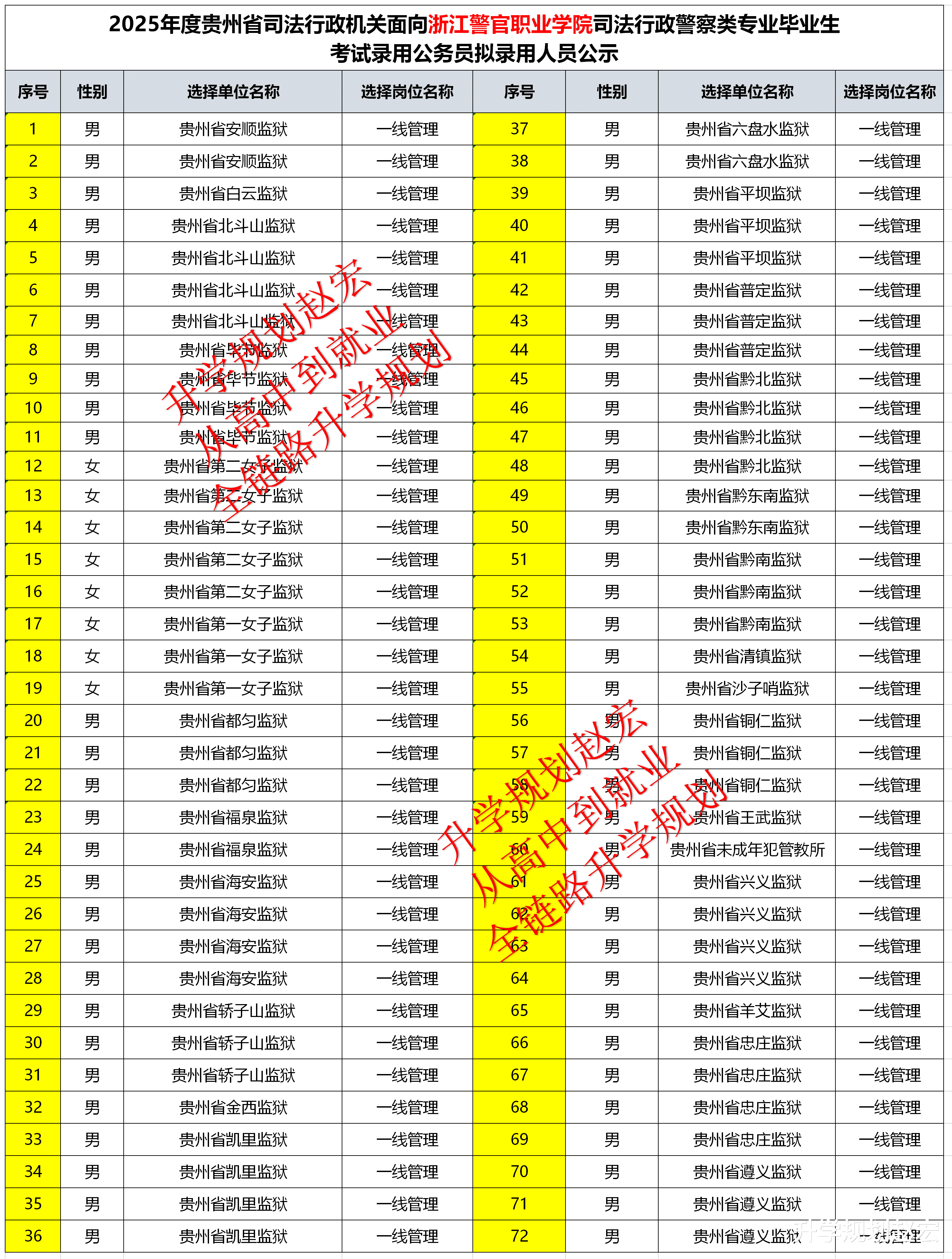 再来看看看浙江警官职业学院数据,总共72人,岗位全部是一线管理,单位都是贵州的各地监狱,女生8人,全部去向是贵州省第一女子监狱和第二女子监狱。这个数据和2024年也是差不多的,2024年总共是84人。从当年的招生计划来看,总共计划100人,实际是多少不清楚,从2024年的数据来看,招录的人数比计划人数还多。具体大家去研究。