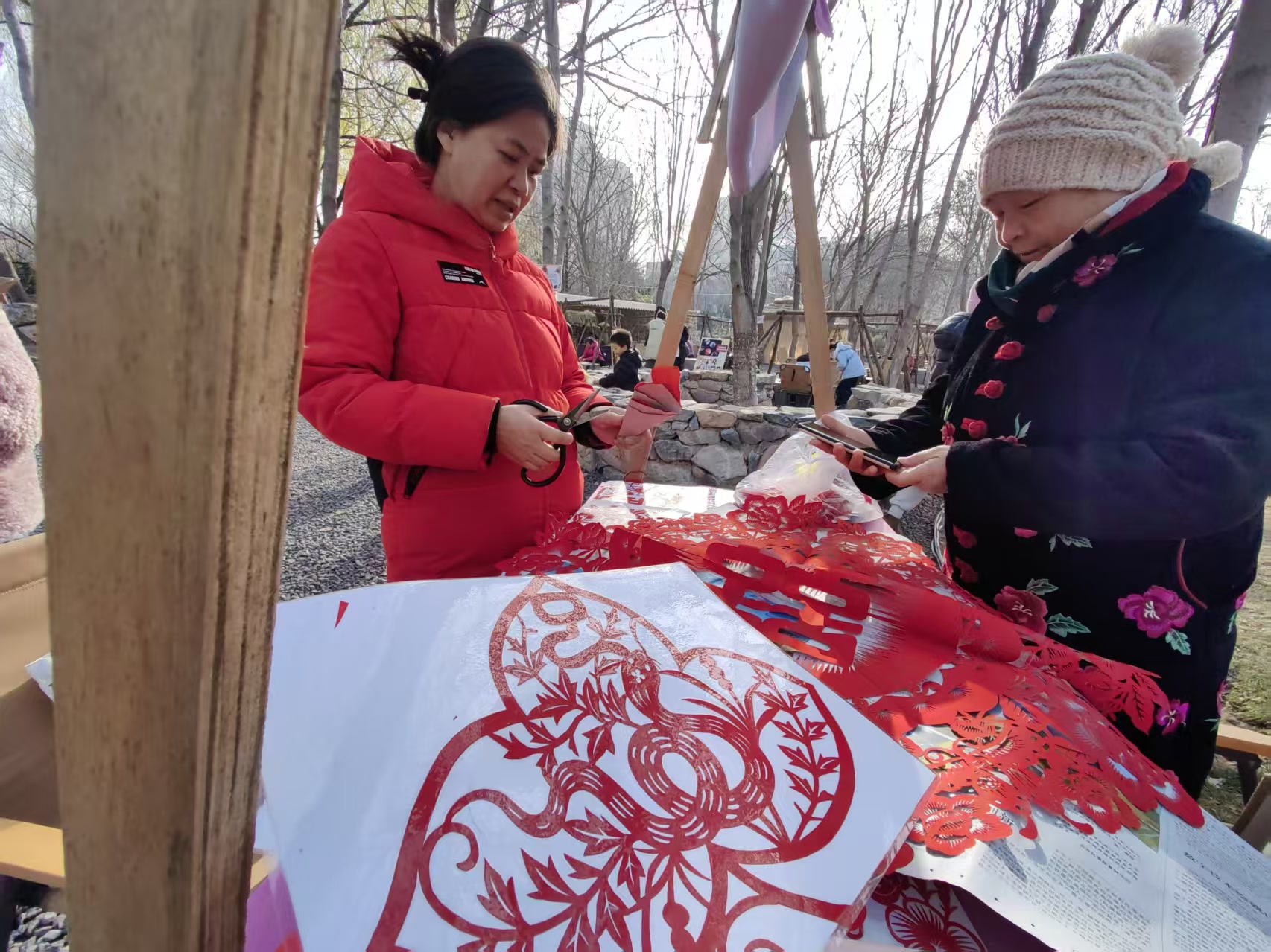 相邻的“万字结门挂”区域,大家以红果、银杏、福牌等元素,编织出寓意“丰收”与“吉祥”的创意门挂。