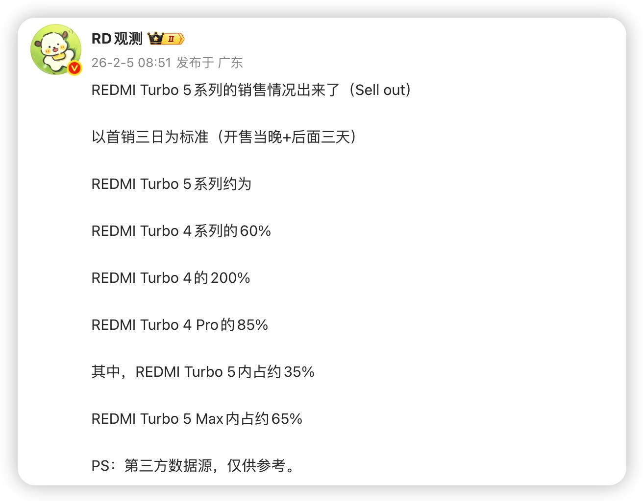 小结对于红米Turbo 5系列这类性能机来说,这次存储芯片价格暴涨的杀伤力是最大的,因为这类产品的利润非常薄,而目标用户对于价格又非常敏感,所以红米Turbo 5系列别说首销三天的表现干不过前代了,就算是整个生命周期也基本上可以肯定干不过。
