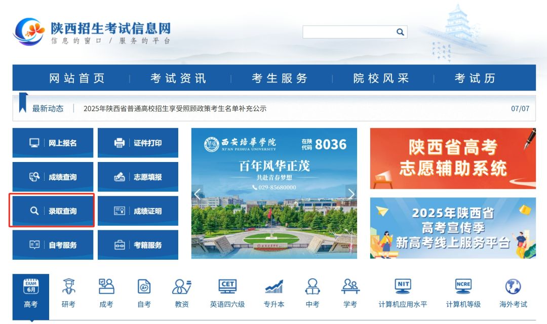 考生可登录陕西省教育考试院门户网站,点击“服务—录取查询—2025年陕西省普通高等学校招生考试”或登录陕西招生考试信息网,点击“录取查询—2025年陕西省普通高等学校招生考试”,进入陕西省高考网上填报志愿系统,在“投档信息”栏目可查询本人录取动态及结果。