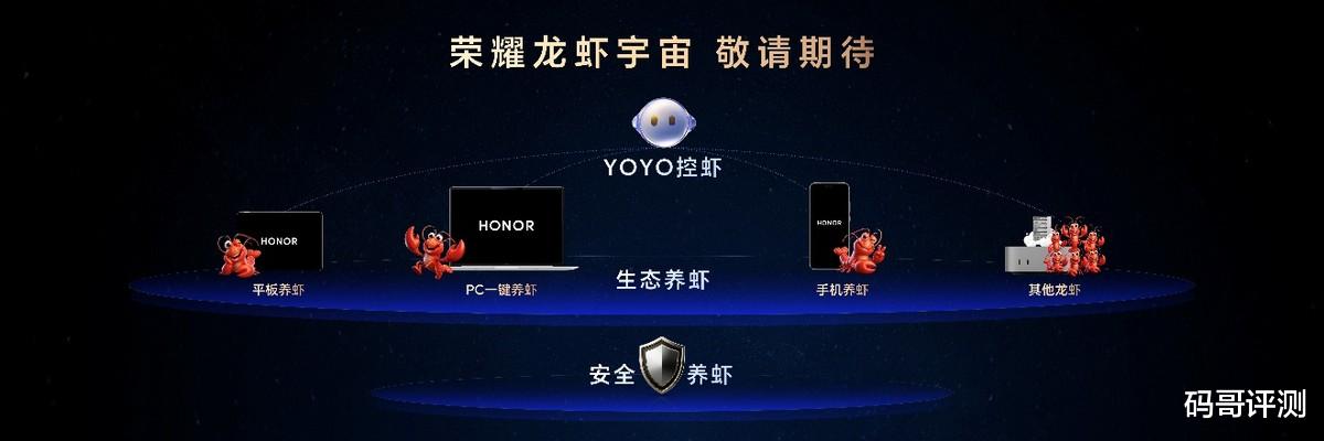 发布会上,还公布了生态级的荣耀龙虾宇宙,支持PC一键养虾、平板养虾,未来还能兼容其他生态设备的龙虾接入。用户可以通过YOYO在荣耀手机上直接和小龙虾交互,并安全地开放手机智能体供小龙虾调用,实现生态养虾、安全养虾和YOYO控虾三大能力。这些功能将于近期陆续开放内测。