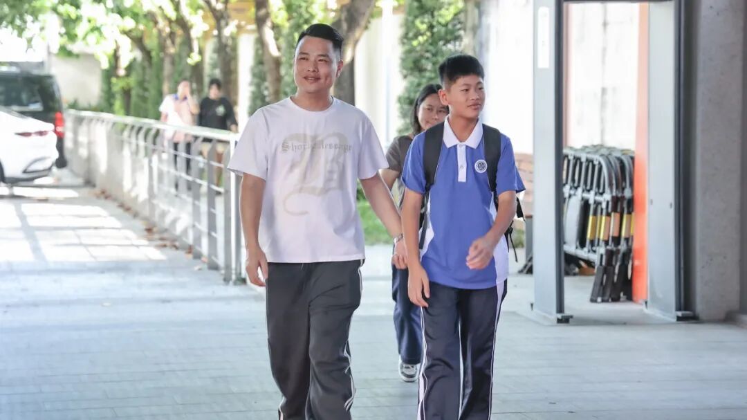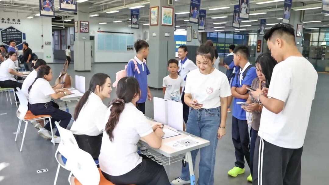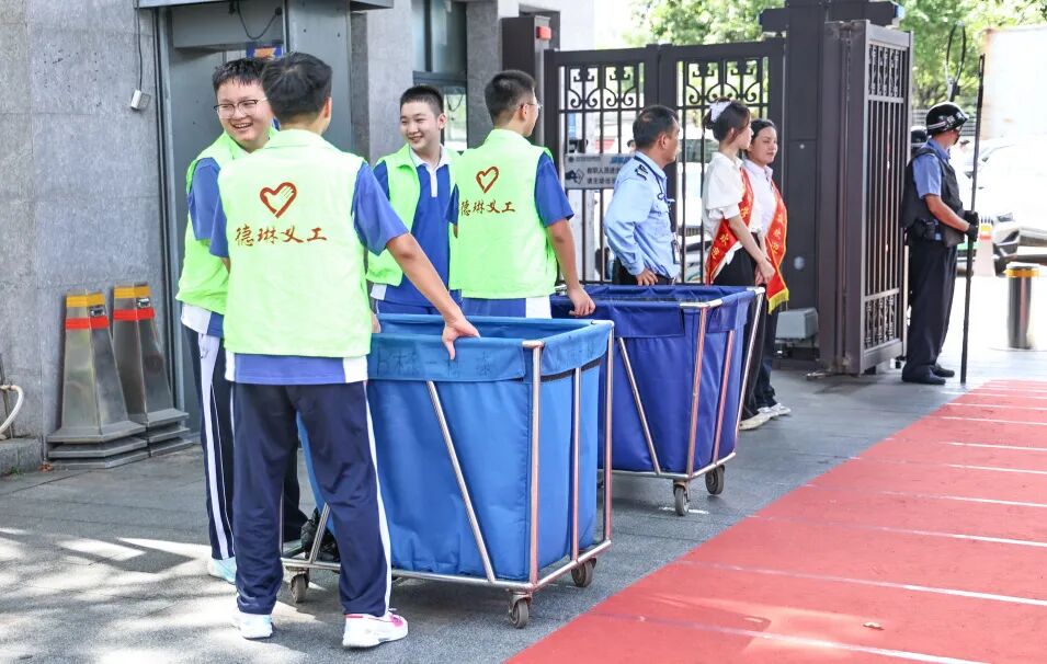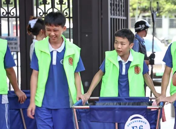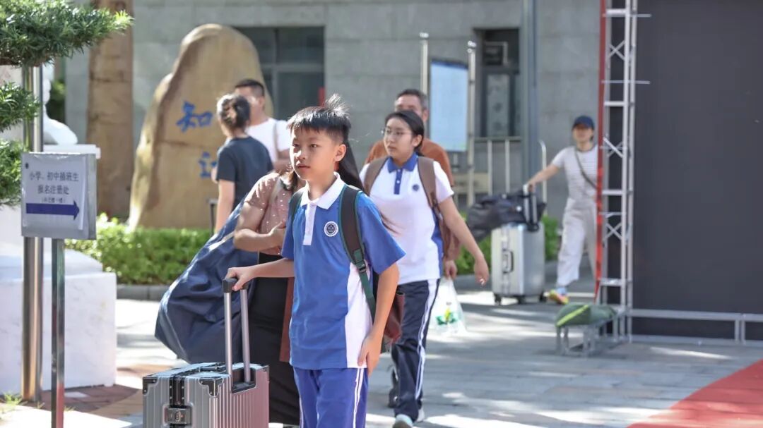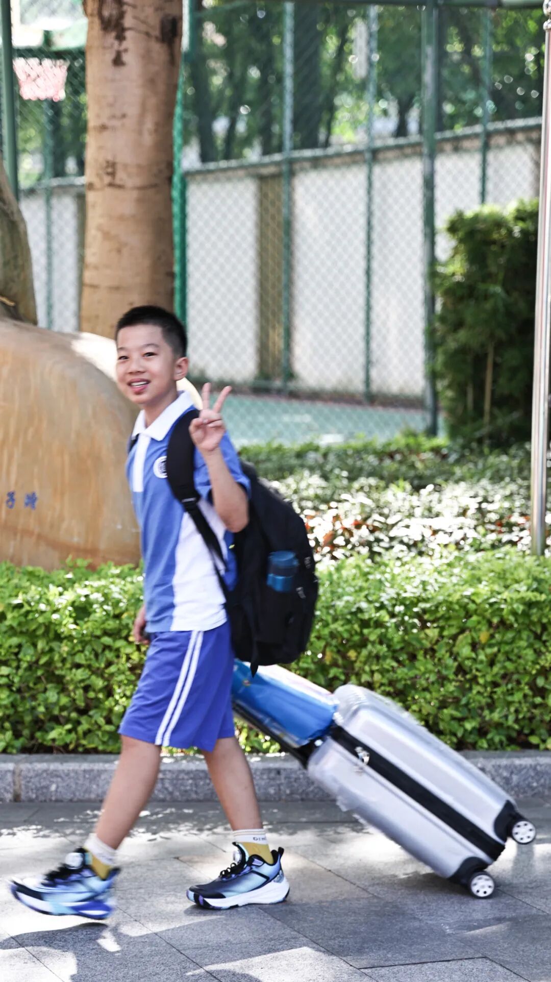 红地毯从校门口蜿蜒向校园深处,像条簇新的绸带,牵引着归来的身影。孩子或拖行李箱,或提鼓鼓的行囊,身边伴着家长满眼的关切;穿荧光绿马甲的“德琳义工”们,推着蓝色行李车,笑着接过沉甸甸的包裹。汗水沾湿鬓角,却浸不淡他们眼底的热忱,只把返校的路,铺得格外顺畅。