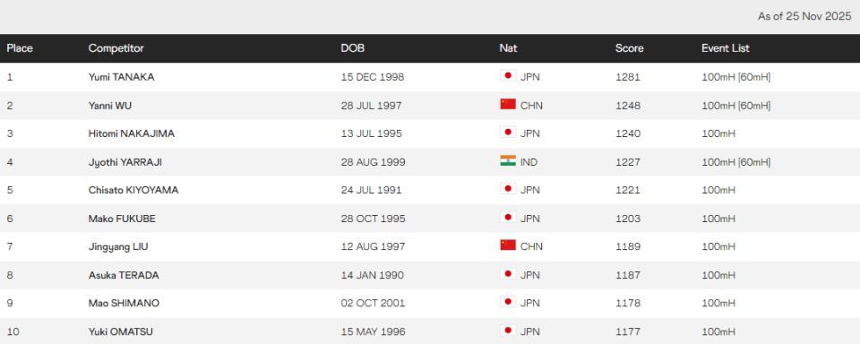 北京时间11月27日,世界田联官网更新了截止本周的各单项世界排名。令人惊讶的是,全运会田径赛事已经结束近一周,这次全运会各个单项的成绩迄今尚未在田联官方数据库里显示。也就是说中国选手的世界排名,依然凭借的是全运会前的国际国内战绩排的名次,其中女子短跨(60米栏、100米栏),田中佑美依然排名亚洲第一,吴艳妮亚洲第二、中岛瞳亚洲第三,刘景扬亚洲第6。如果全运会成绩能尽快被田联官方承认,刘景扬的世界积分和排名将大幅上升。