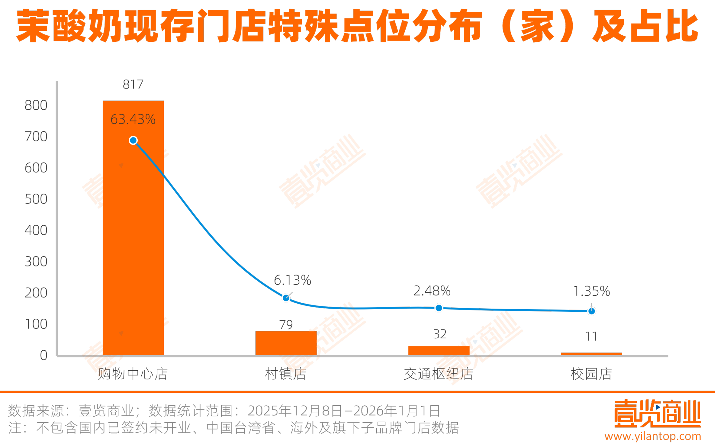 茉酸奶的门店选址则呈现鲜明的聚集性。购物中心门店数量高达817家,占比63.43%,品牌希望通过购物中心点位稳定的客流基础,覆盖年轻白领等核心客群,同时借助综合体的品牌聚合效应提升自身曝光度。