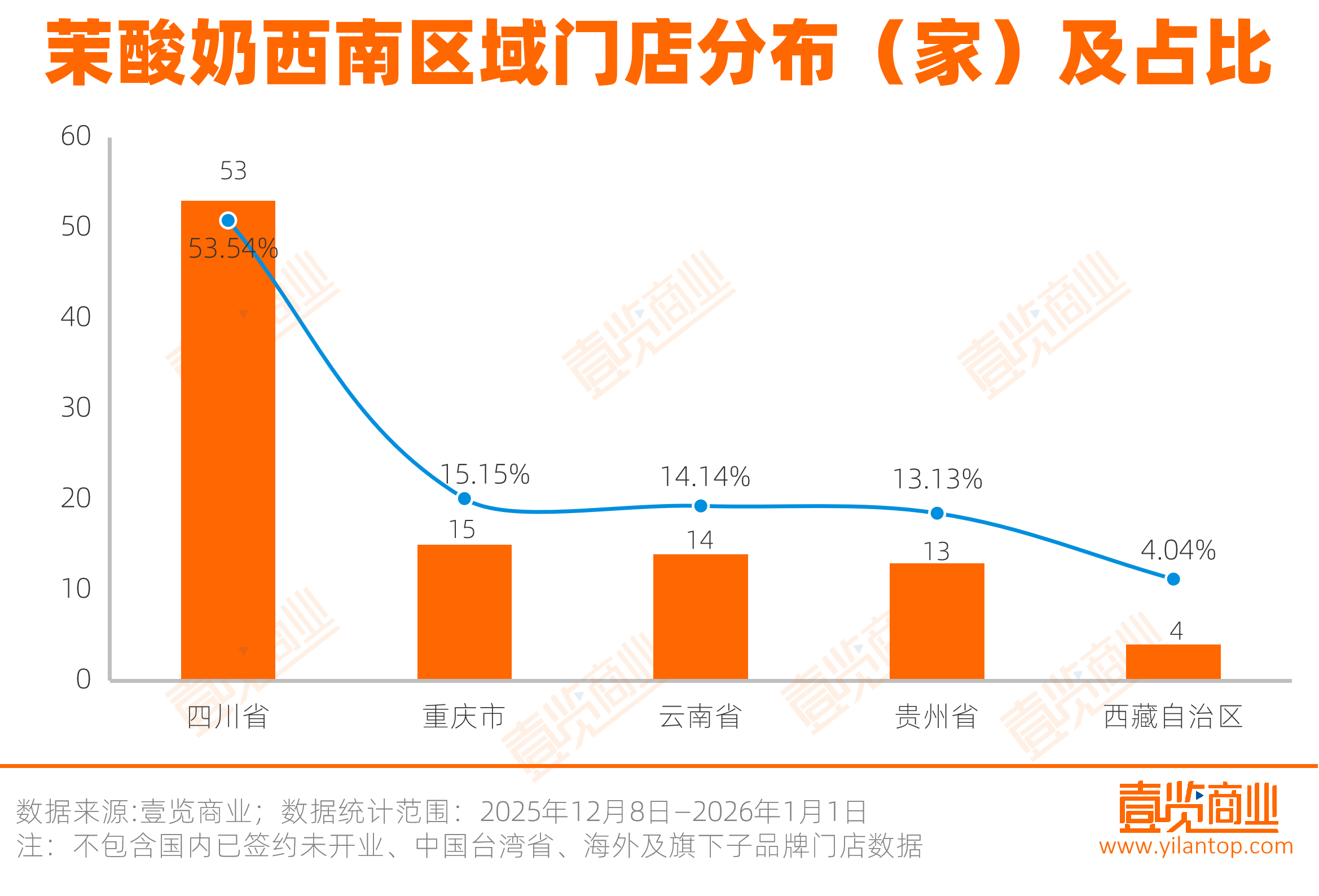 在西南区域,四川省以53家门店占据了半壁江山,重庆市、云南省、贵州省规模相当,西藏自治区仅有4家门店。