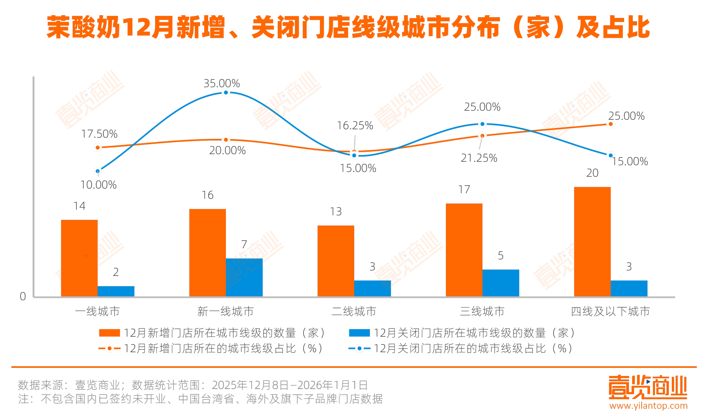 从城市线级来看,新增门店分布较为均衡。新增最多的是三线及以下城市,共新增37家,占比25%,说明品牌正在积极探索向下沉市场渗透。三线城市的17家新增门店占比21.25%,与四线及以下城市共同构成了12月近一半的新增数量。新一线与二线城市的新增门店合计占比37.5%,二线城市新增最少,仅贡献16.25%的新增占比。