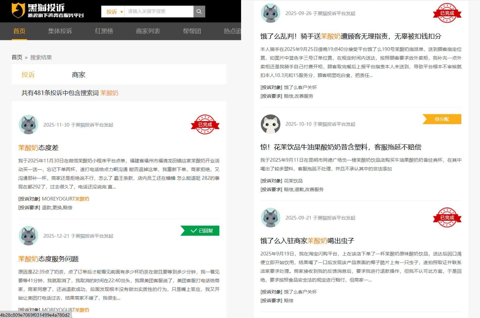 二是茉酸奶的品牌口碑面临考验。打开黑猫投诉平台,共有481条投诉中包含搜索词茉酸奶,最近的几条投诉内容都是聚焦于茉酸奶的服务态度差,往下翻看可以看到关于众多食品安全问题以及外卖骑手相关问题的投诉内容,对品牌形象形成持续消耗。