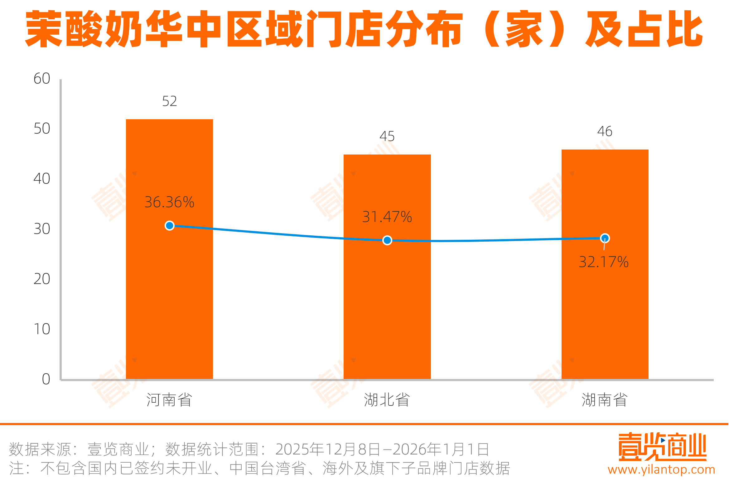 在华中区域,茉酸奶的门店分布呈现出三足鼎立的格局,河南、湖北、湖南占比均在30%上下。