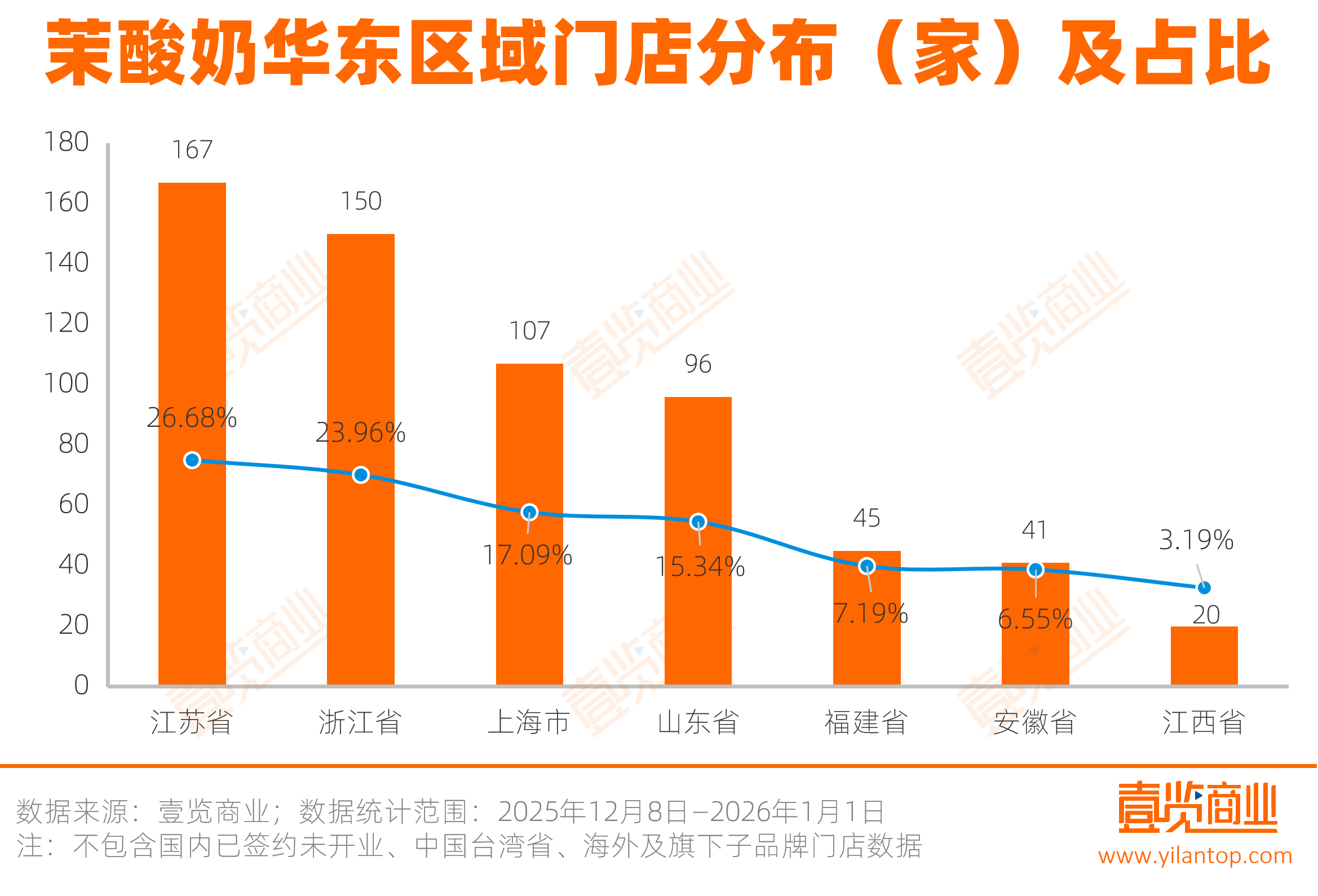 在华东内部,江苏省和浙江省为品牌贡献了半数以上的门店;而作为直辖市的上海市,门店数高达17.09%居于第三;安徽、福建门店数刚过40家,占比合计超过13%;江西省的17家门店是区域内占比最少的,仅3.19%。