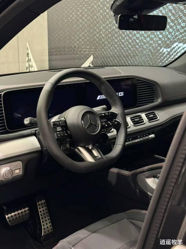 内饰方面,相比GLE450,用料更加考究一些,座椅等都是真皮材质包裹,AMG方向盘,上面布满了AMG操控单元,中控12.3英寸屏下方为碳纤维材质,GLE450这一部分只是普通实木装饰,AMG风格座椅,带前排座椅加热功能,主副驾驶座椅都带电动记忆功能,七座布局提供13700元选配。