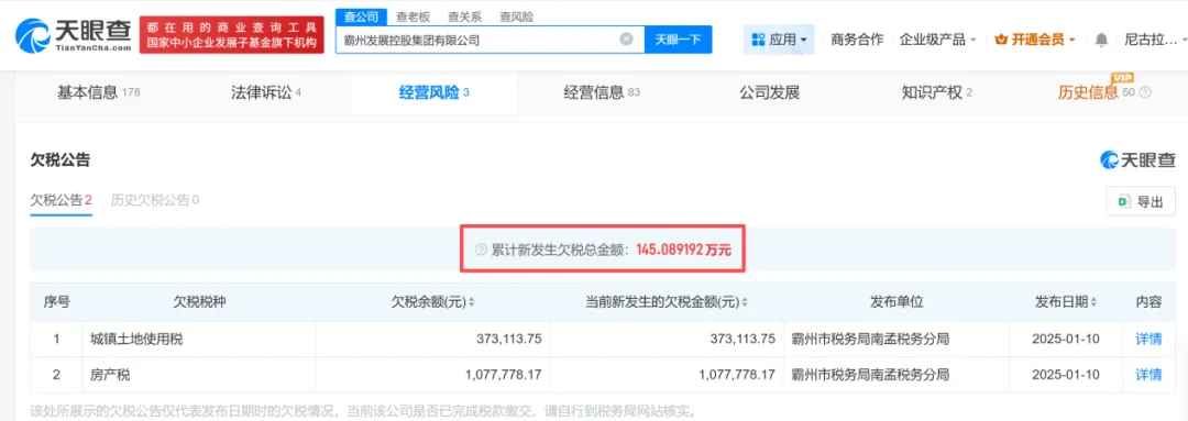 天眼查公开信息显示,2025年1月10日,国家税务总局霸州市税务局南孟税务分局披露,霸州发展控股存在城镇土地使用税、房产税欠缴情形,两项欠税余额分别为37.31万元、107.78万元,合计欠税145.09万元,且两项欠税均被明确标注为“当前新发生的欠税金额”。此次新增欠税加剧市场对其长期税务合规性的担忧。