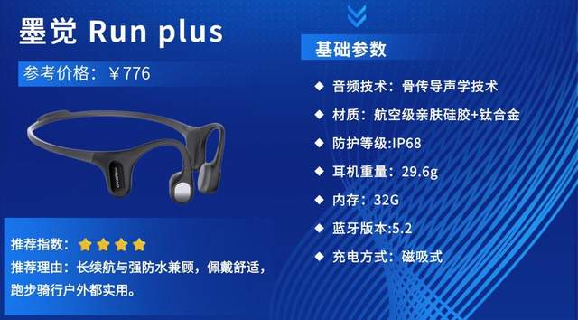 推荐理由:墨觉Run plus定位进阶款运动骨传导耳机,专为中高阶运动爱好者设计,延续墨觉核心声学技术,兼顾音质、佩戴与防水,适配跑步、骑行、户外训练等多种场景,凭借均衡性能成为进阶运动人群优选。