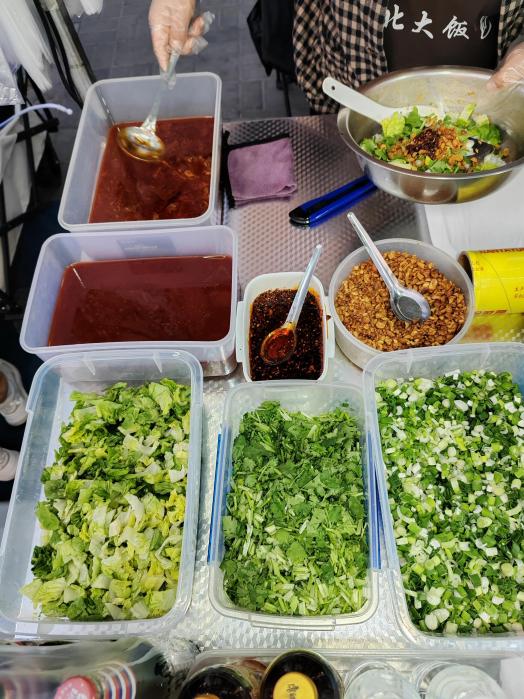 夜市里的特色小吃铺,摊位收拾得干净,饭包用新鲜生菜包裹,米饭、土豆泥、鸡蛋搭配均匀,酱料咸香适中,分量扎实,逛夜市时解馋很合适。