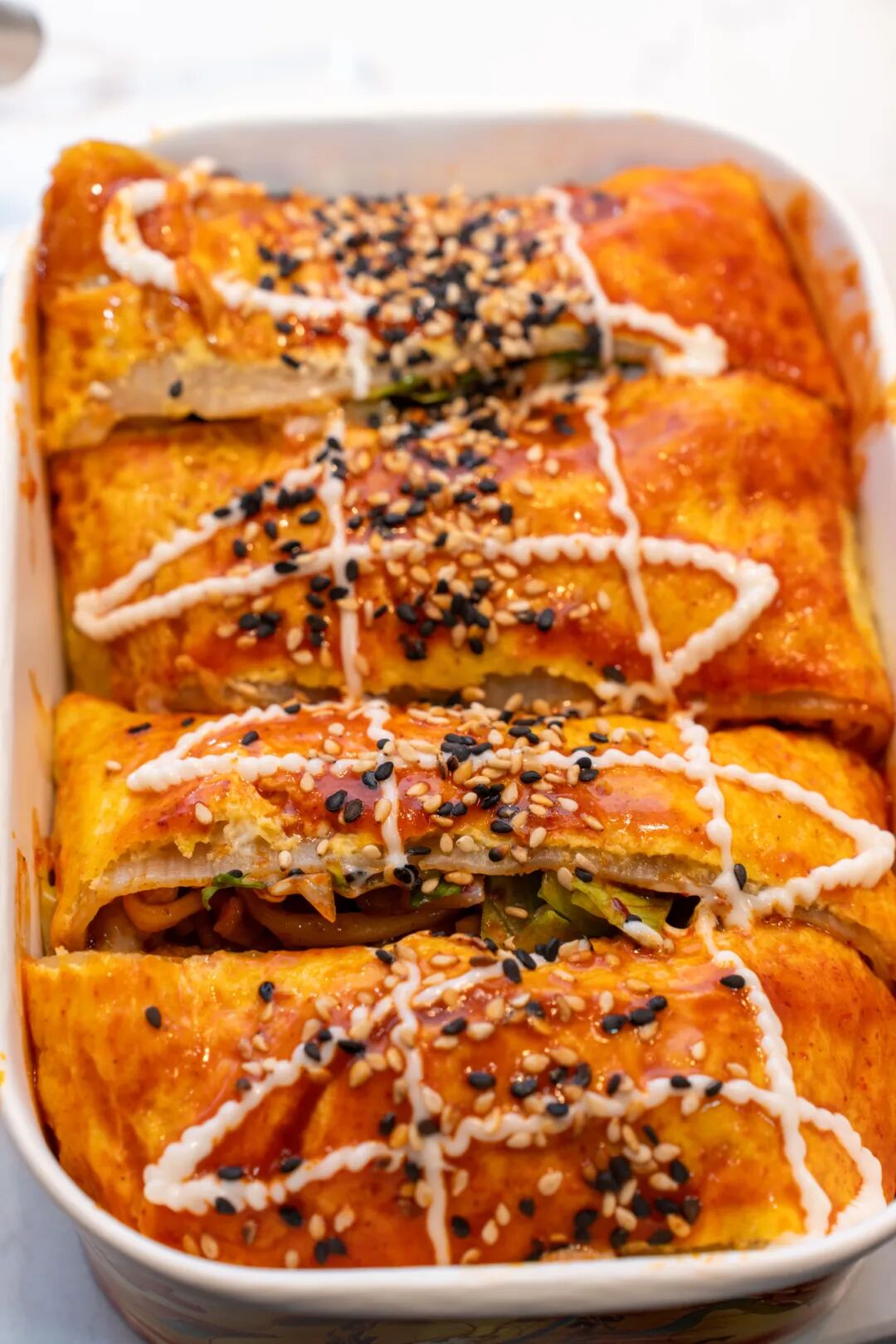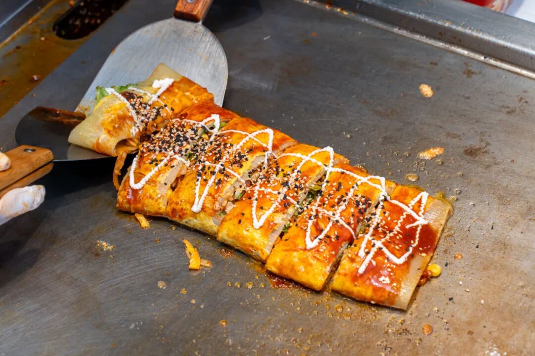 烤冷面的制作过程很利索,在滋滋冒油的铁板放上冷面片,磕个鸡蛋划散,刷上芝士辣酱和火鸡面卷成卷,切的时候那“擦擦”声比任何SPA都解压。
